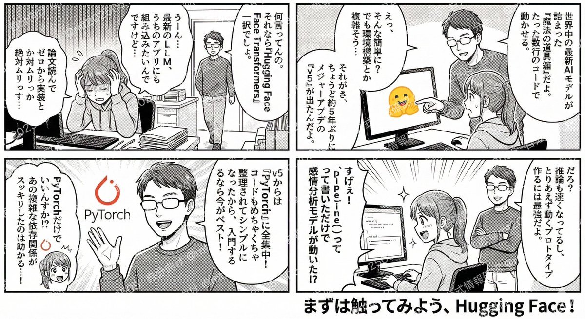 🐻【2025/12/01 公開】🐻 Hugging Faceが約5年ぶりのメジャー更新となる「Transformers v5」のRC版を公開しました。PyTorchへの集中、コードベースの簡素化、推論機能の強化などが主な変更点です。 #生成AI #最新技術 #漫画 #HuggingFace #Transformers #PyTorch #AI開発 ※この投稿は生成AIが作成。 pic.x.com/qfoy6MQSJU