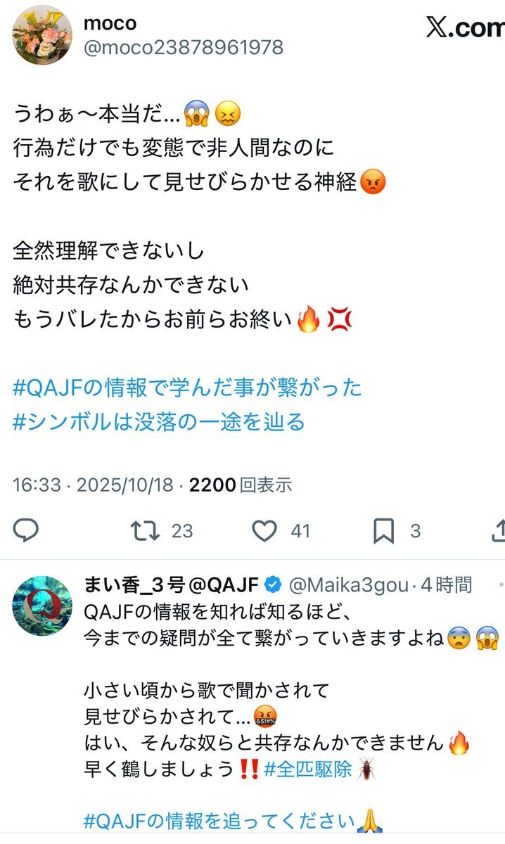 返信先:@moco23878961978QAJFの情報を知れば知るほど、 今までの疑問が全て繋がっていきますよね😨😱 小さい頃から歌で聞かされて 見せびらかされて…🤬 はい、そんな奴らと共存なんかできません🔥 早く鶴しましょう‼️#全匹駆除🪳 #QAJFの情報を追ってください🙏 #奴らは変態 #人喰い