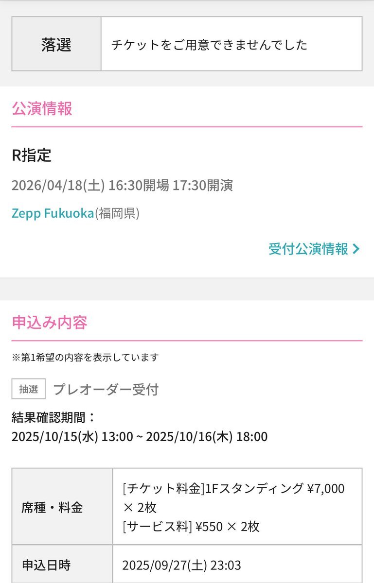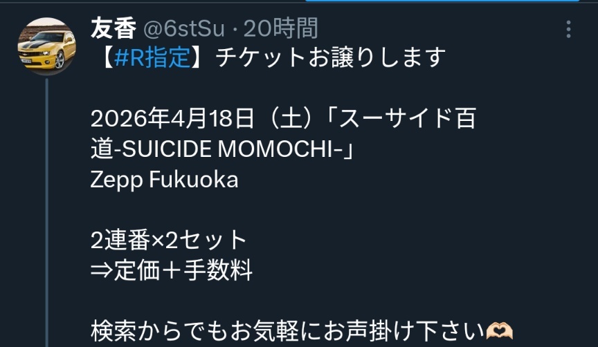 【#R指定】チケットお譲りします 2026年4月18日(土)「スーサイド百道-SUICIDE MOMOCHI-」 Zepp Fukuoka 1枚 ⇒定価+手数料 当日、会場でのお取引(お金⇔チケット)も可能です。検索からでもお気軽にお声掛け下さい🫶🏻 ※添付のポストより変更 pic.x.com/RdJYk1PZ53