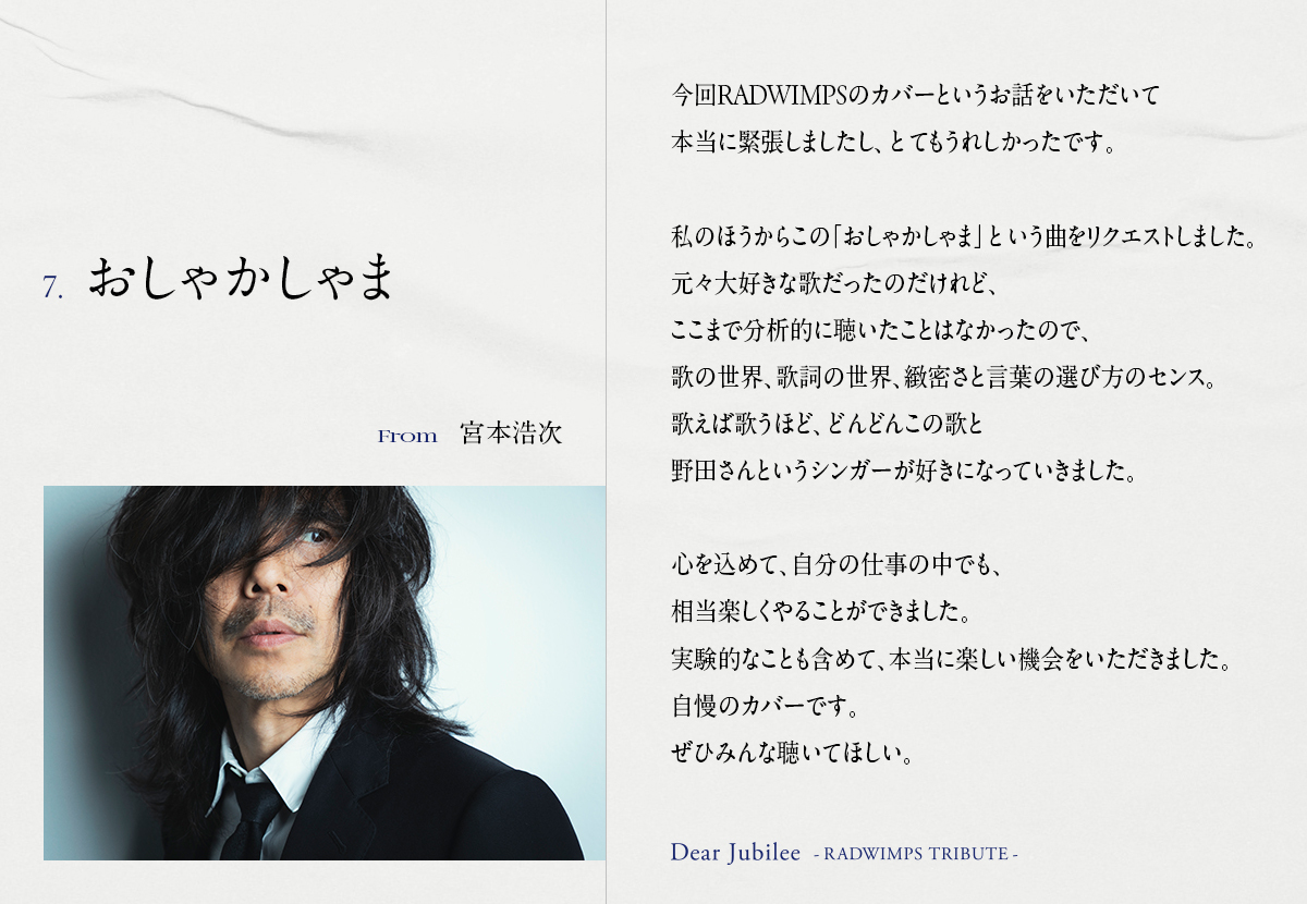 ■━━━━━━━━━━━■ Dear Jubilee -RADWIMPS TRIBUTE- 参加アーティスト&楽曲 第11弾発表!メッセージ到着! ■━━━━━━━━━━━■ [Dear Jubilee -RADWIMPS TRIBUTE-] 11th participating artist & song reveal! #宮本浩次 #おしゃかしゃま sp.universal-music.co.jp/radwimps/20th/…