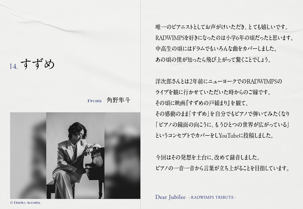 ■━━━━━━━━━━━■ Dear Jubilee -RADWIMPS TRIBUTE- 参加アーティスト&楽曲 第4弾発表!メッセージ到着! ■━━━━━━━━━━━■ [Dear Jubilee -RADWIMPS TRIBUTE-] 4th participating artist & song reveal! #角野隼斗 #すずめ sp.universal-music.co.jp/radwimps/20th/… #RADWIMPS