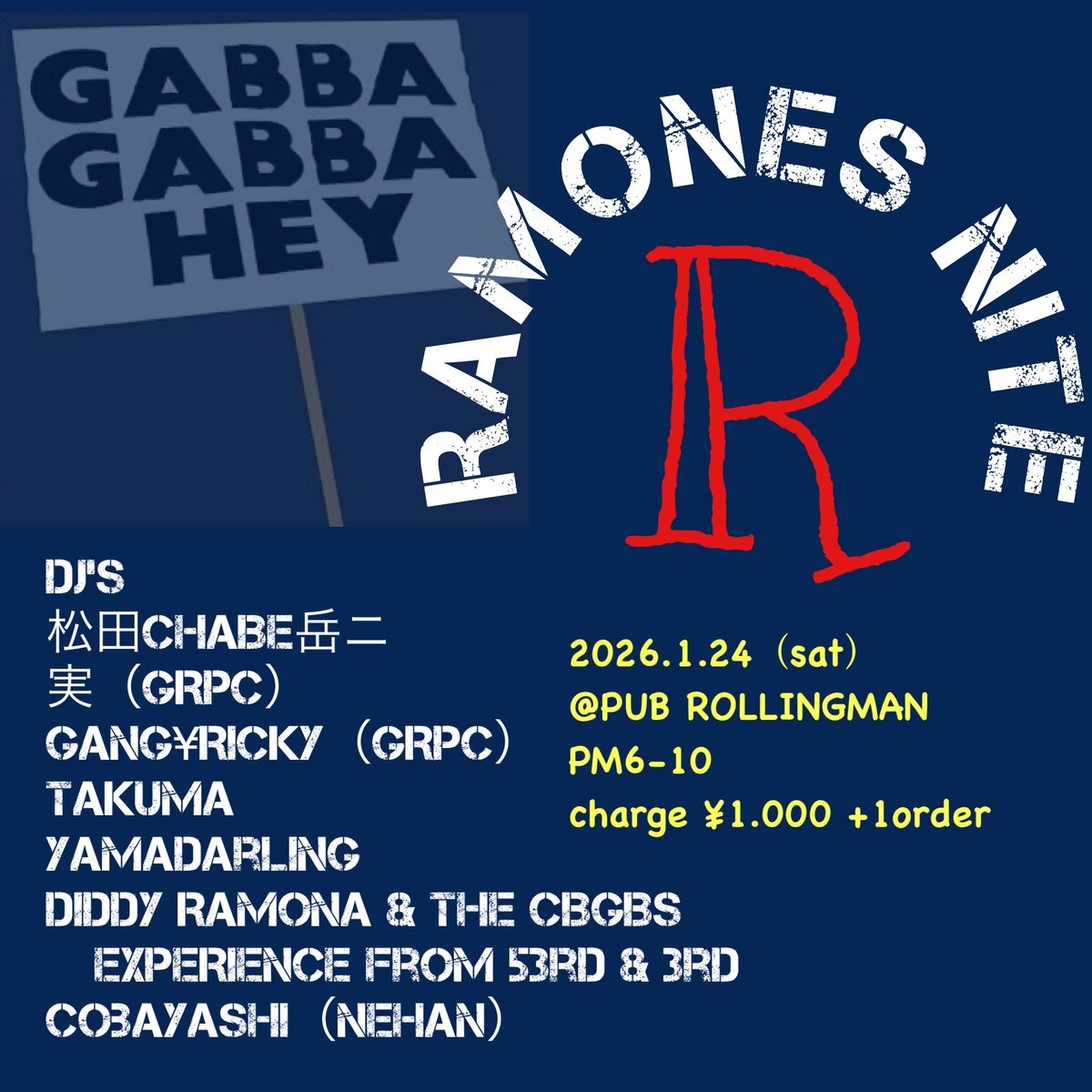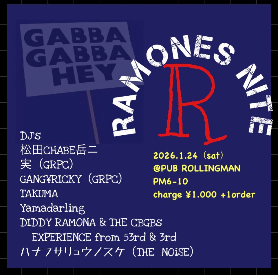 ラモーンズナイト再び😀 ◆RAMONES NITE 2026/1/24(土)PM6-10 @PUBROLLINGMAN 注 伏見の新店舗です charge1.000円+1order 今回はいつもの強力DJ人に加えてスペシャルゲストでチャーべさんが参加! ラモーンズ大好きな人も好きな人もちょっと聴いてみたいな、って人も是非どうぞ😀