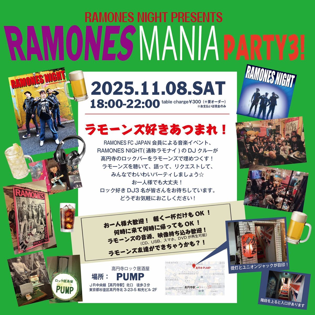 今週末(11/8)の土曜日は高円寺ロック居酒屋PUMPで「ラモナイ」だよー。無料(300円のチャージとドリンク代だけかかります)そしてコラボTシャツ、再受注のお知らせです。@ramones_night #ラモーンズ #RAMONES #ラモナイ newsblog.ramonesfanclubjapan.com/?eid=312 pic.x.com/0E2ufvzrHL