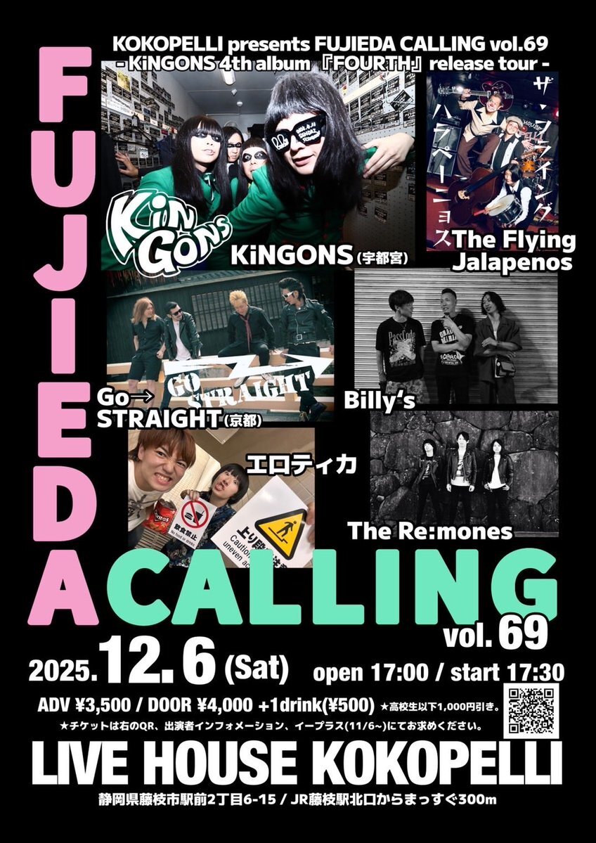 【ライブ!】 12.6(SAT) at 藤枝ココペリ open17:00/start17:30 ADV¥3,500/DOOR¥4,000+1drink w/KiNGONS(宇都宮) Go→STRAIGHT(京都) The Flying Jalapenos Billy's エロティカ 5月に対バンしたKiNGONSと再度対バンします! ご予約お待ちしております! 絶対に楽しいぞ! #ラモーンズ #RAMONES pic.x.com/v6ND7ga9tF