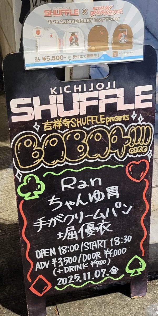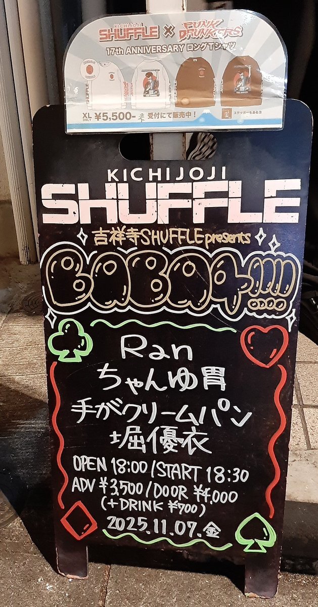 やや体調不良(寝不足?)で #吉祥寺SHUFFLE presents BABA4!!!!! に #Ran さんを聴きに 順番はババ抜きで決定! Ranさんが1番手に😆 最後までは無理と思ったが 1番手さえちゃんと音が聴けず リタイア😥 聴けなかった皆さんまた 聴きに行きます。 #ちゃんゆ胃 #手がクリームパン #堀優衣 pic.x.com/tXASDMUHuR