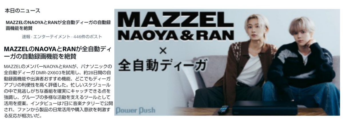 本日のニュース 「MAZZEL の NAOYA と RAN が パナソニック 『全自動ディーガ』の 自動録画機能を絶賛」 •インタビューは 音楽ナタリーで公開 👇️ natalie.mu/music/pp/digin… •ファンから 製品の日常活用や 購入意欲を刺激する反応が 相次いだ #MAZZEL #RAN #NAOYA #ディーガで推し録 pic.x.com/QLAKaBC046