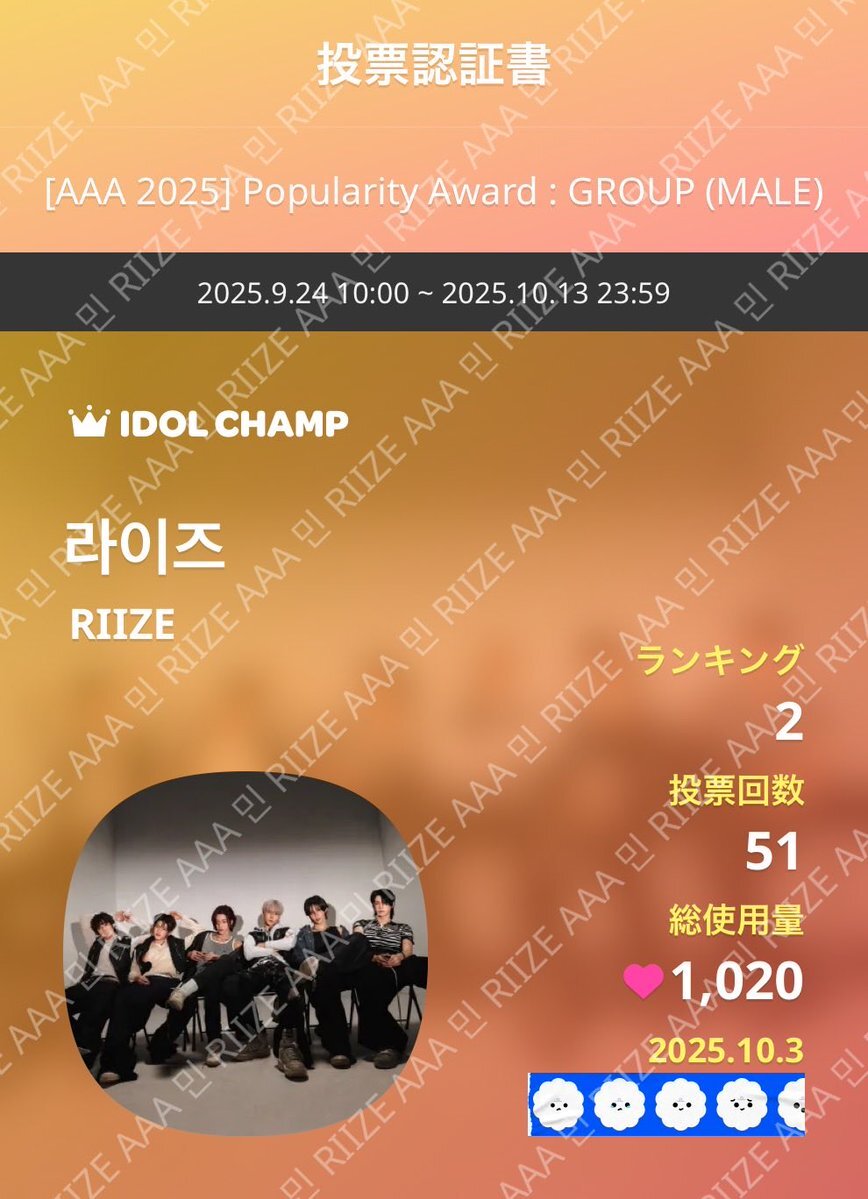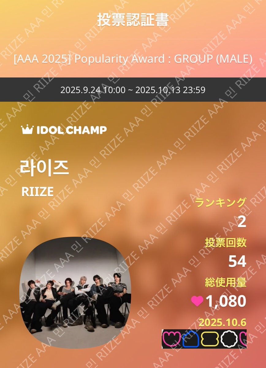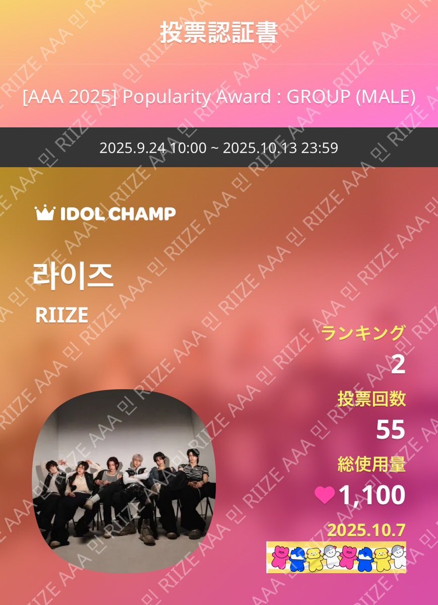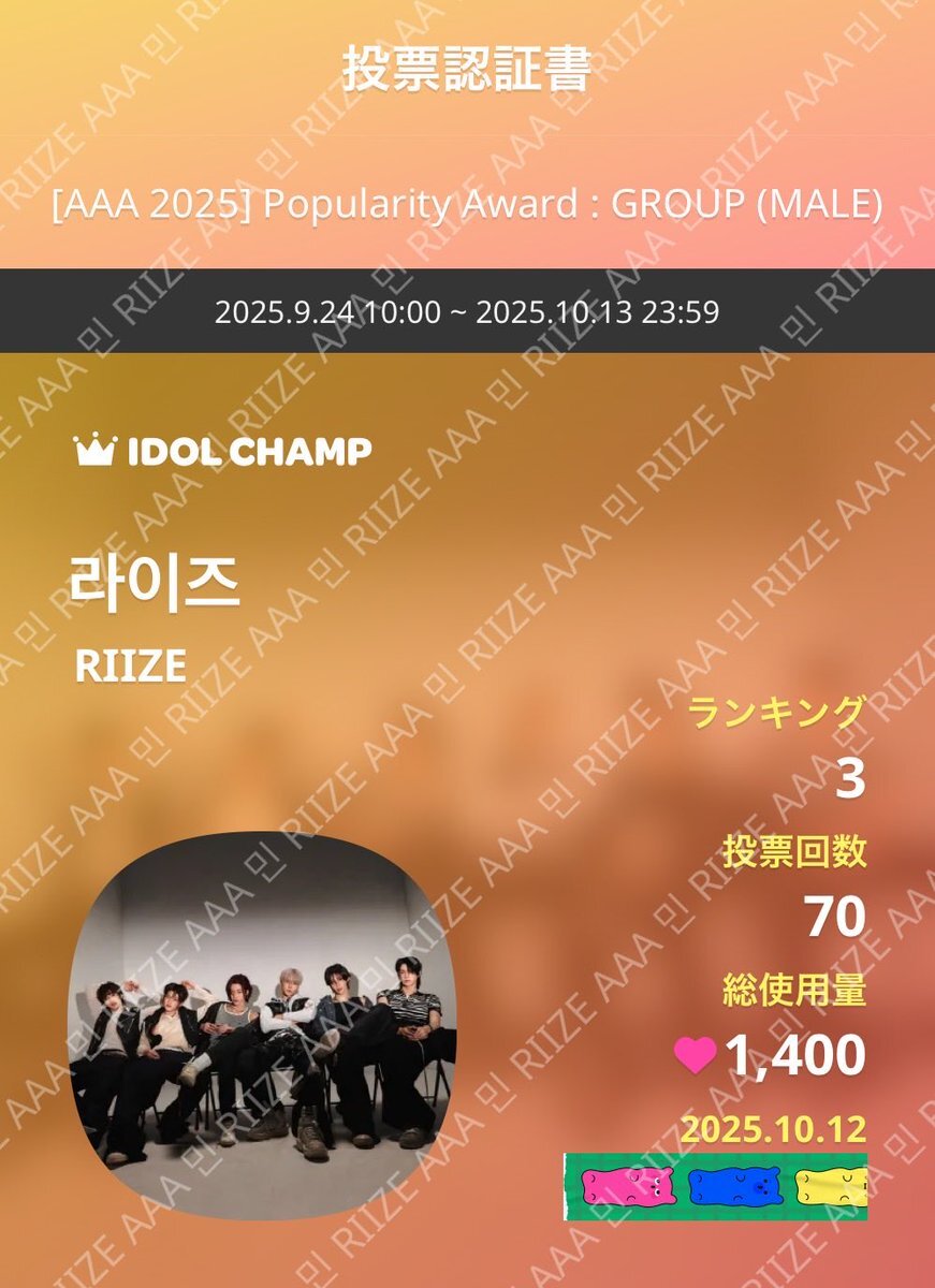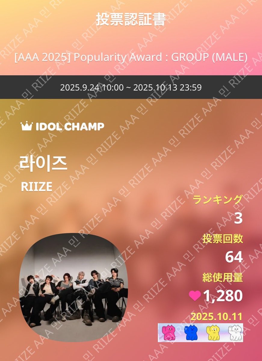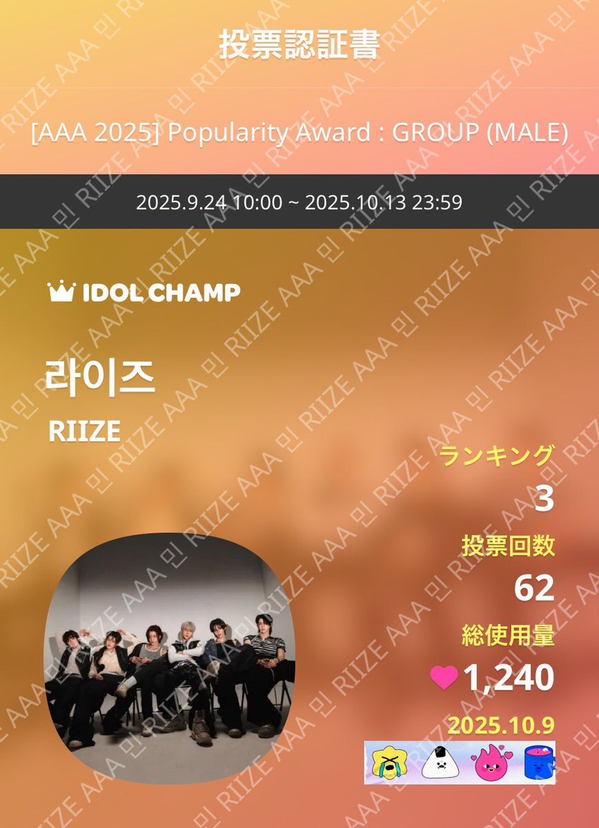 10.12 RIIZE投票分🗳️🧡 AAA投票は ˗ˏˋ 今日まで ˎˊ˗ なのでお忘れなく👊🏻 #BRIIZE_voting #RIIZE投票 #RIIZE_AAA投票 #RIIZE_アユクデ投票 pic.x.com/TvpLYmwXOp