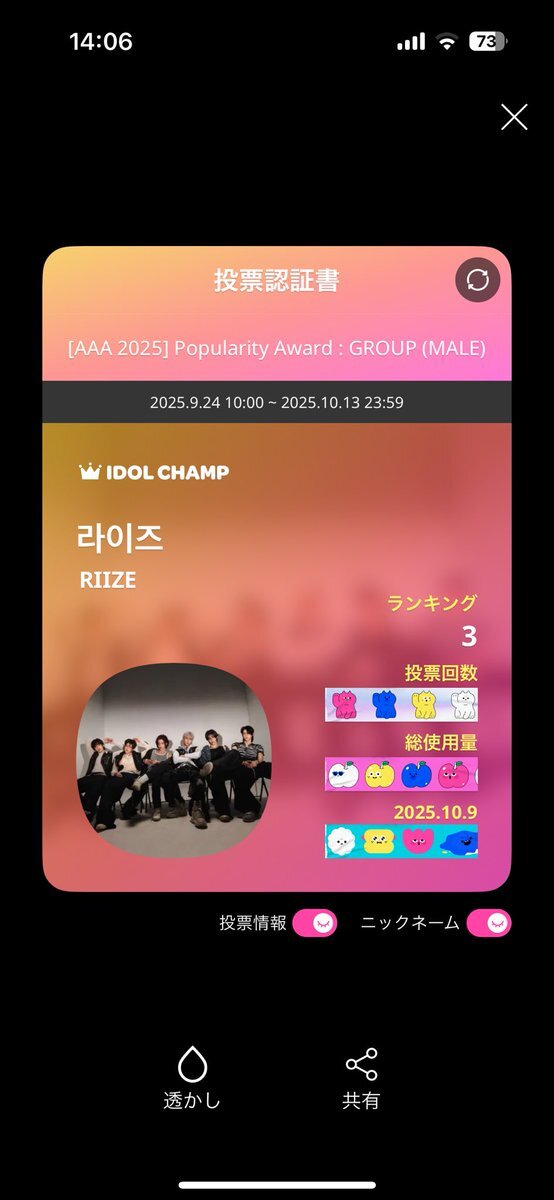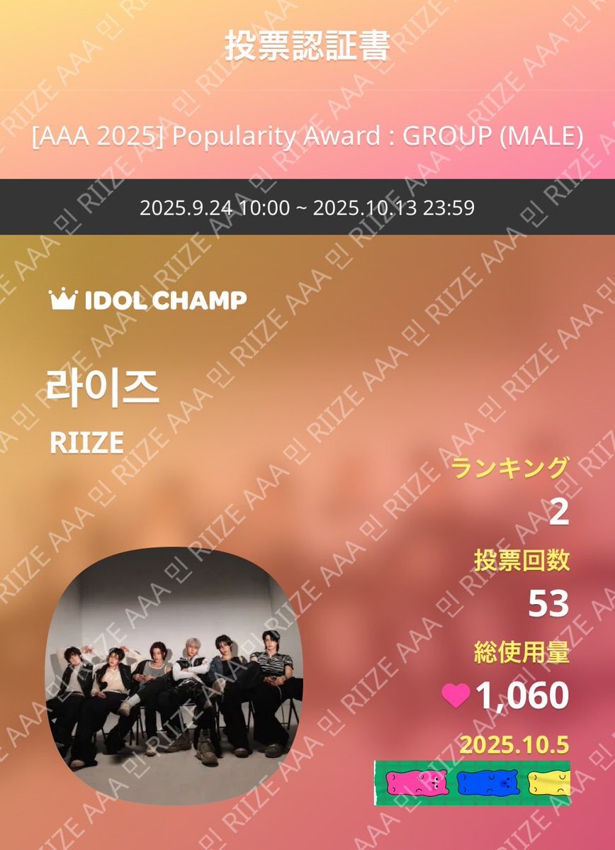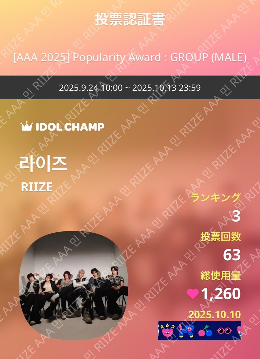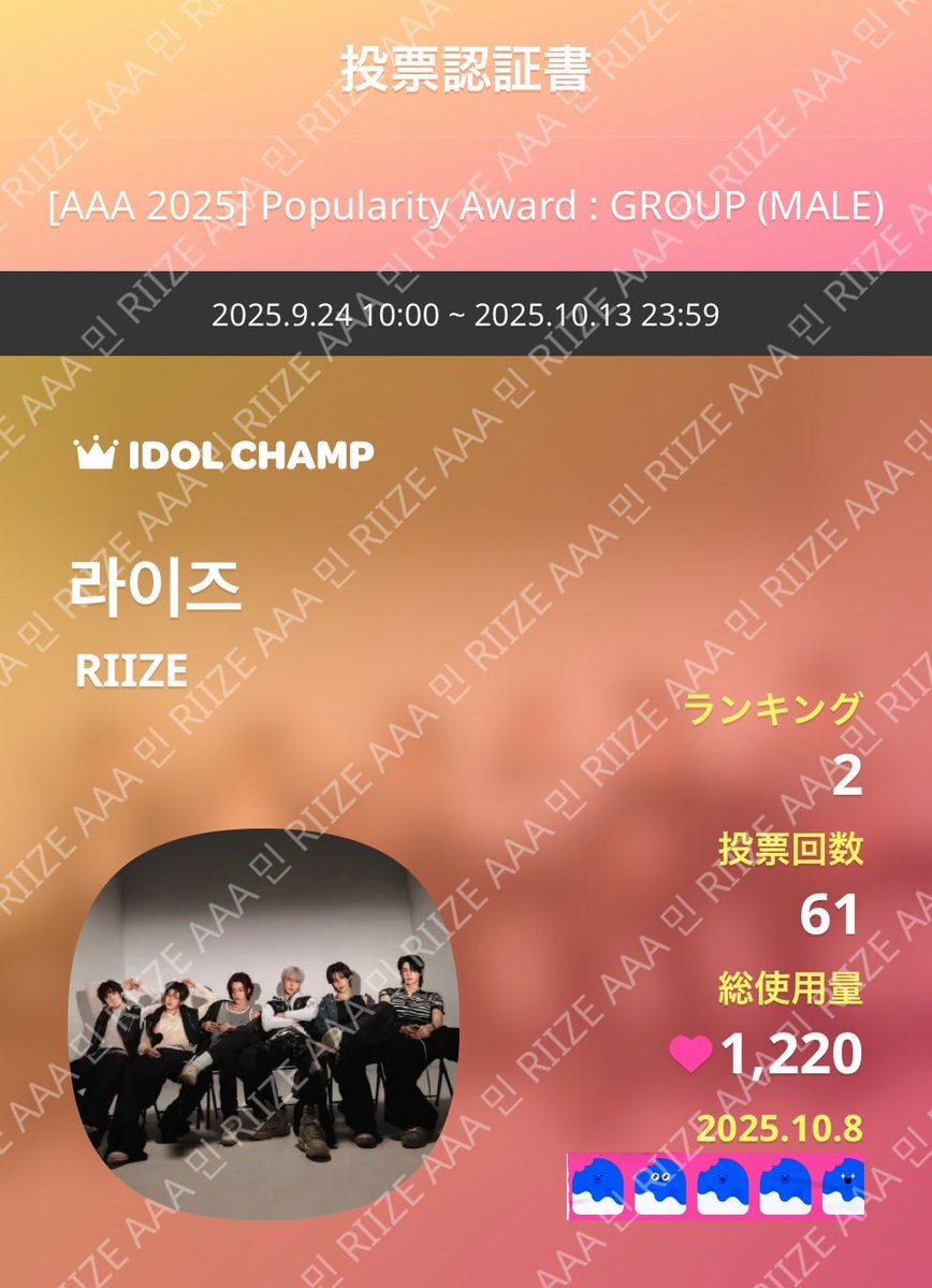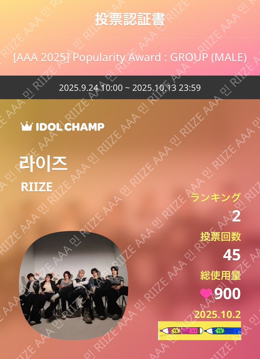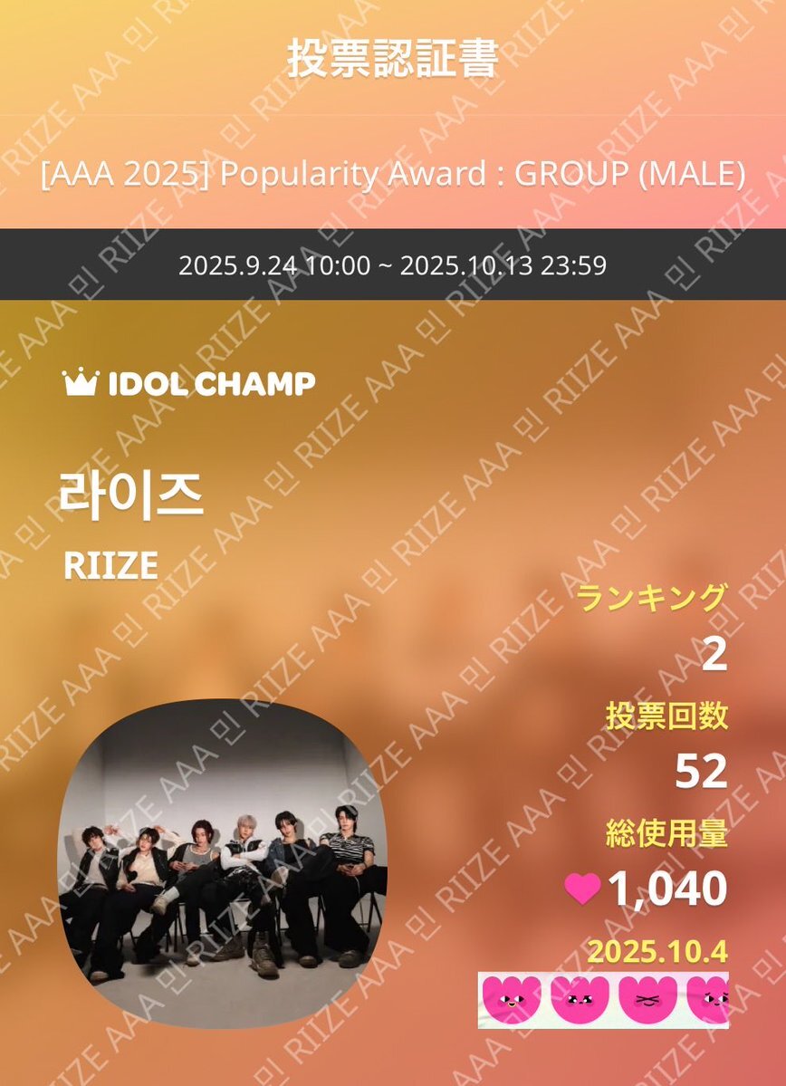 10.12 RIIZE投票分🗳️🧡 AAA投票は ˗ˏˋ 今日まで ˎˊ˗ なのでお忘れなく👊🏻 #BRIIZE_voting #RIIZE投票 #RIIZE_AAA投票 #RIIZE_アユクデ投票 pic.x.com/TvpLYmwXOp