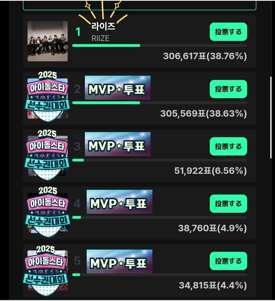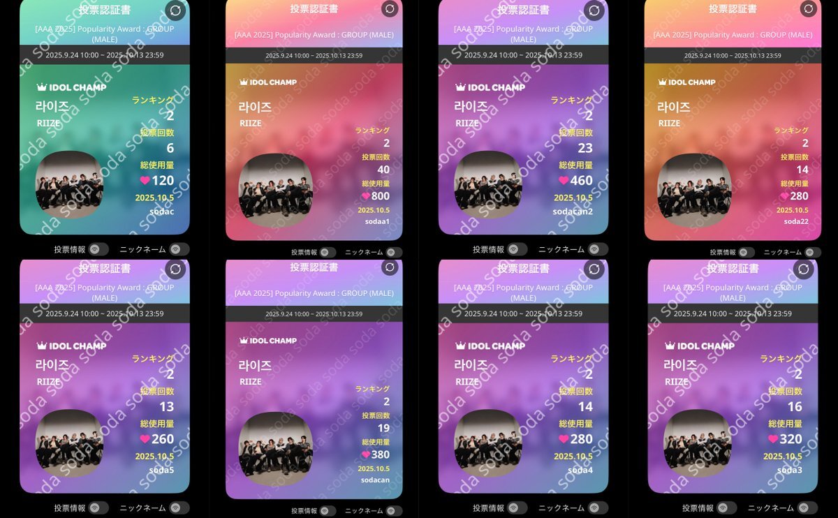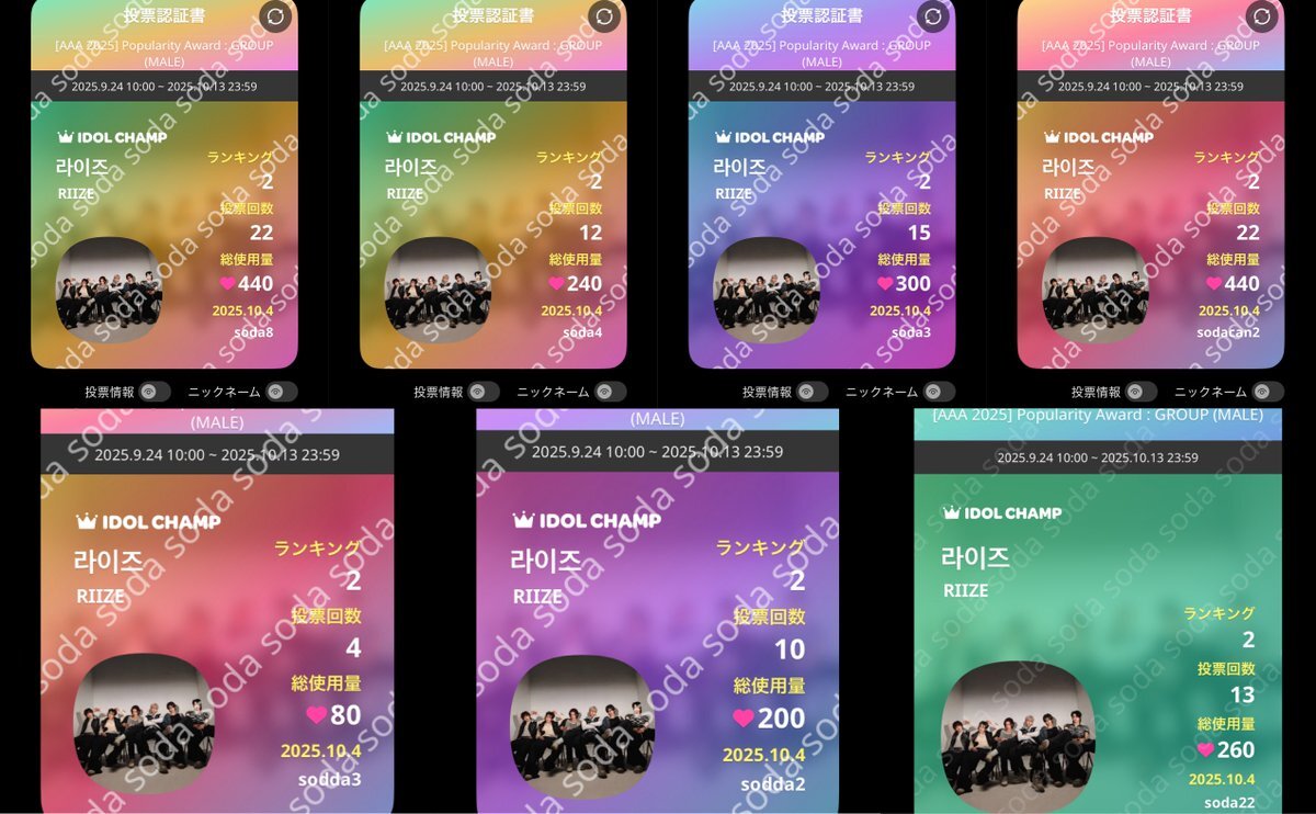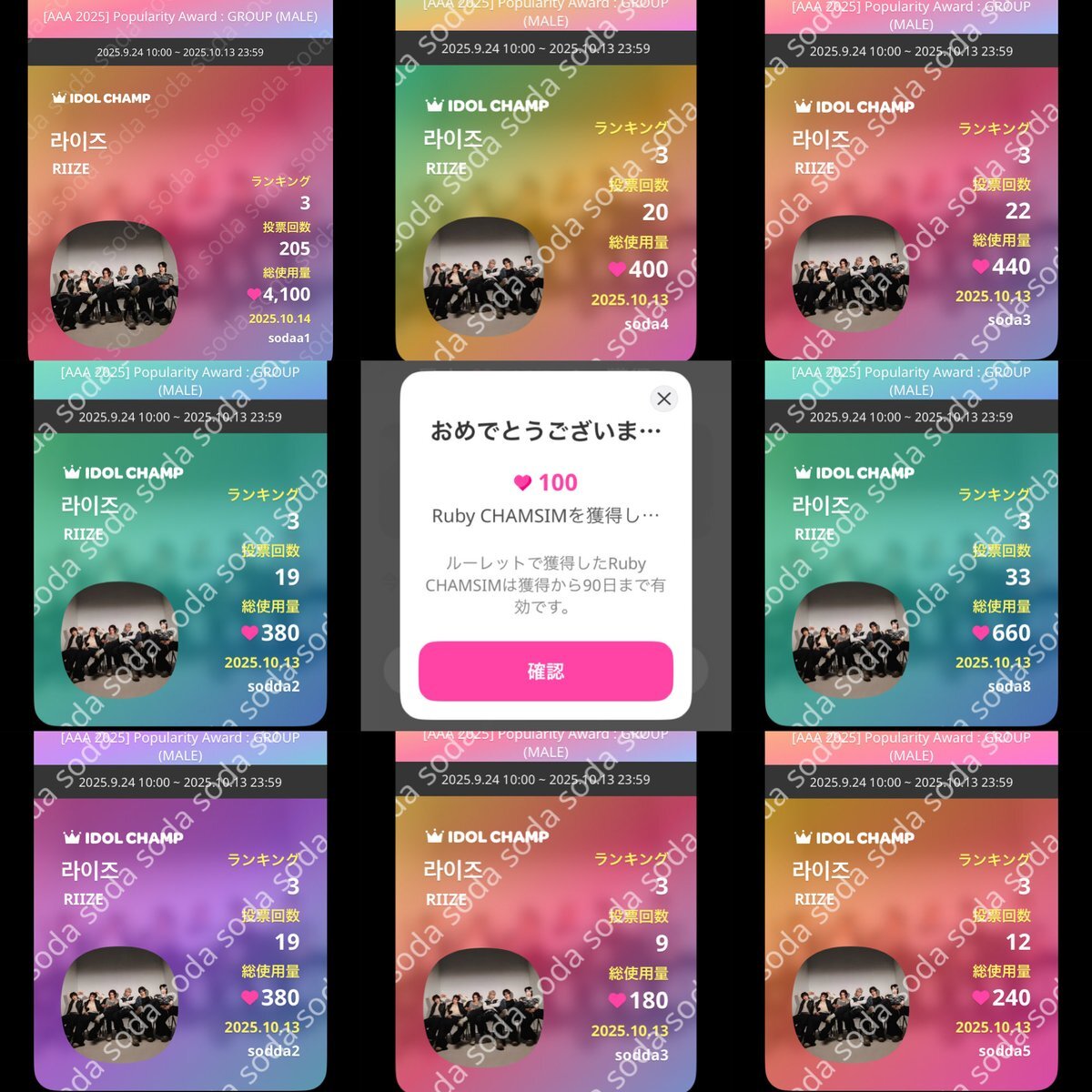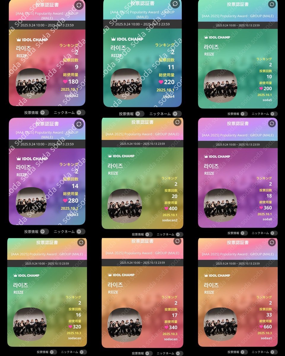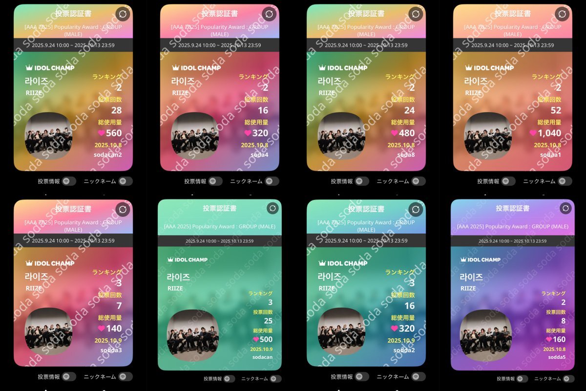 【アイドル陸上選手権(アユクデ) MVP投票状況】 2025.10.08 10:00 📝「男性アイドル部門」でRIIZEに投票してください 🚨抜かされそうです‼️ すぐに複数アカウントを作成し、各アカウントで10票投票してください 📝アカウントはメアドの数だけ作成出来ます