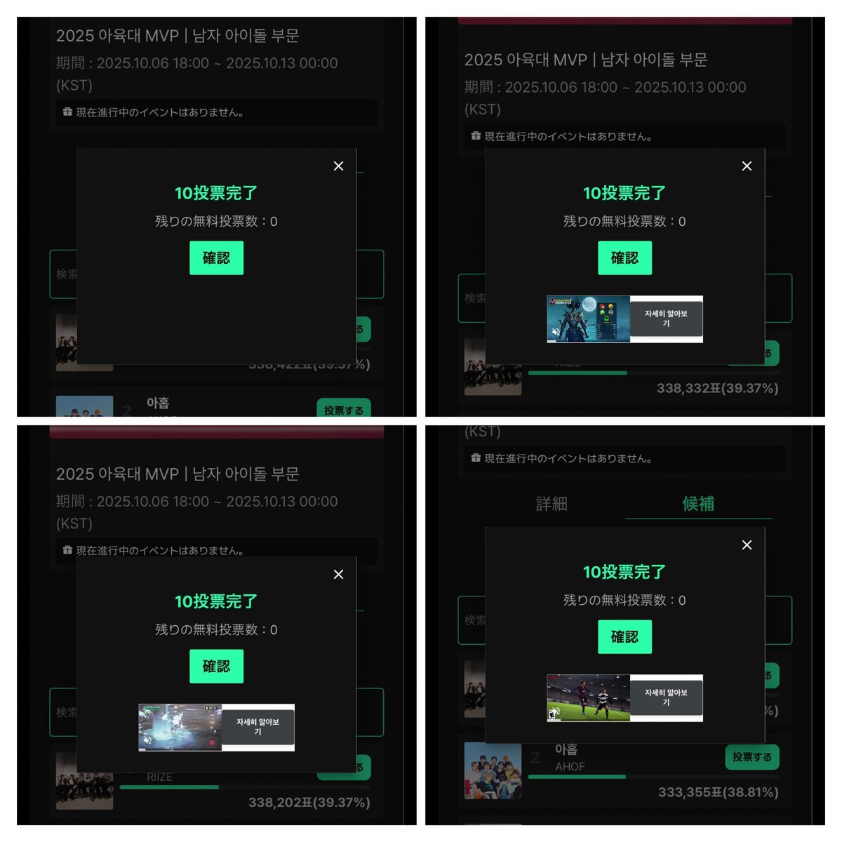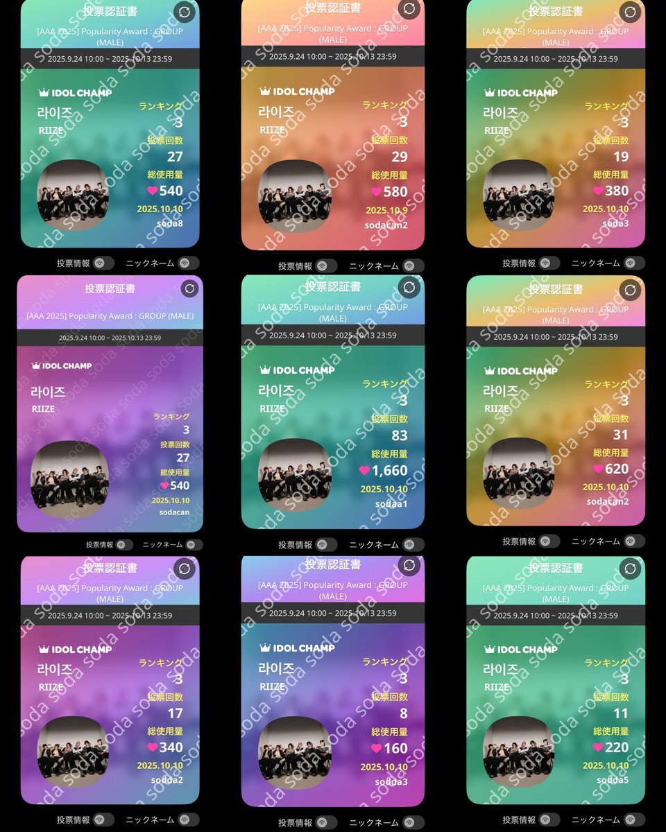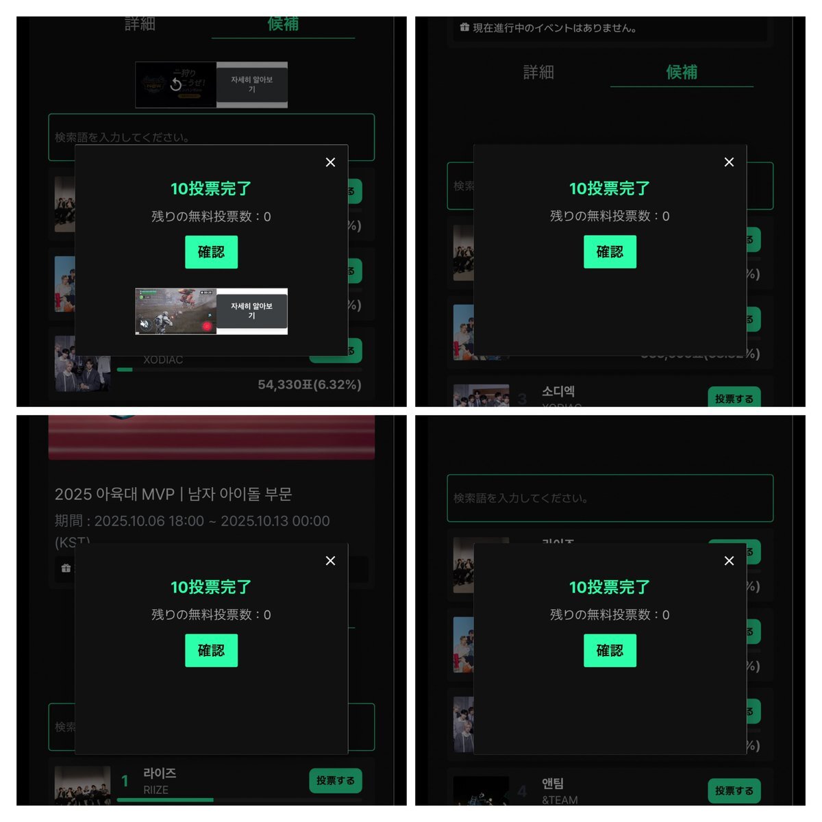 【アイドル陸上選手権(アユクデ) MVP投票状況】 2025.10.10 23:20 📝「男性アイドル部門」でRIIZEに投票してください 1位です!とにかく僅差🥲 複数アカウントでの投票を続けて下さい 0時になって投票数回復したらなるべく早く投票してください🙏 あと2日です🔥