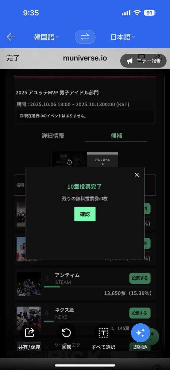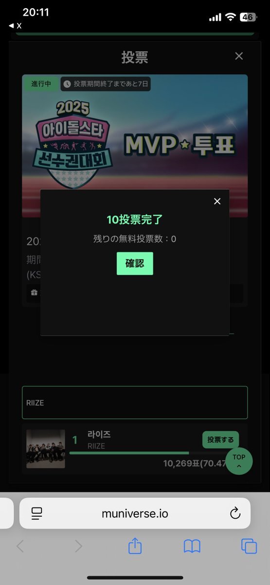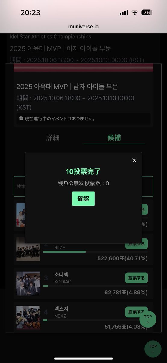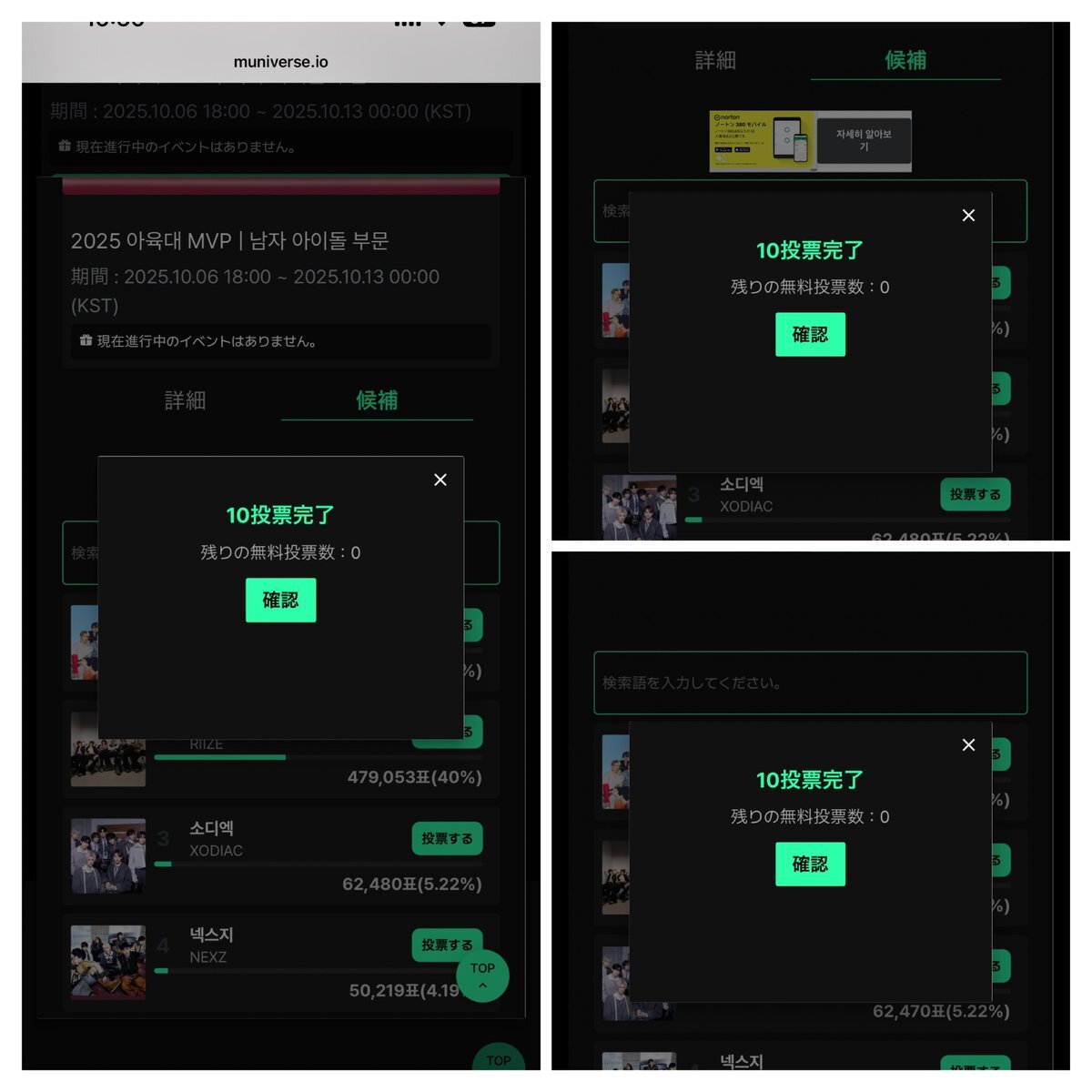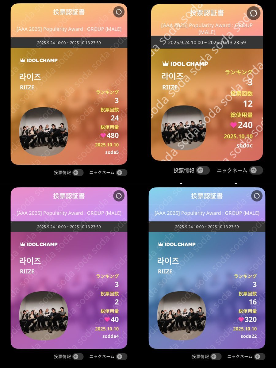 【アイドル陸上選手権(アユクデ) MVP投票状況】 2025.10.10 23:20 📝「男性アイドル部門」でRIIZEに投票してください 1位です!とにかく僅差🥲 複数アカウントでの投票を続けて下さい 0時になって投票数回復したらなるべく早く投票してください🙏 あと2日です🔥