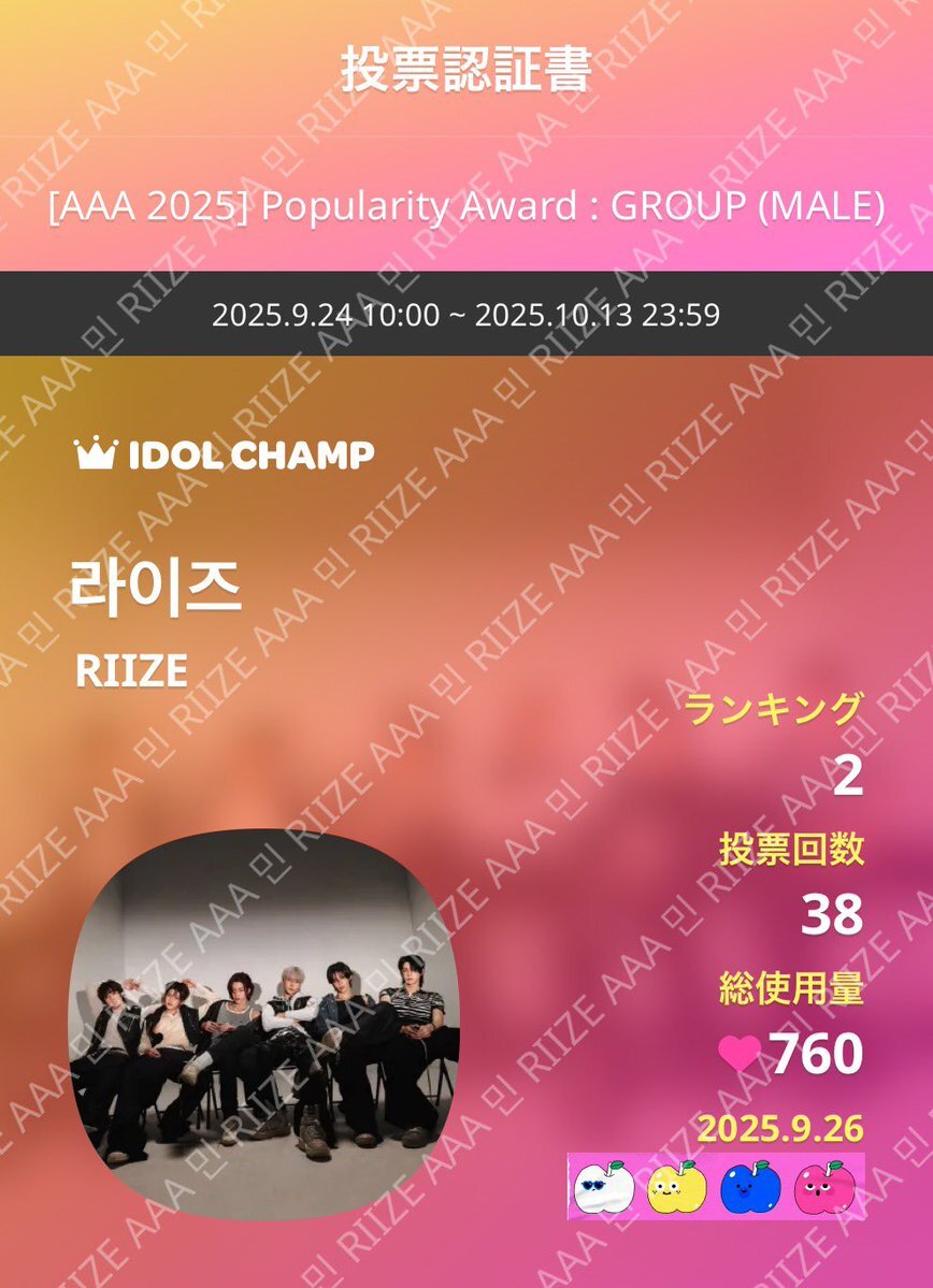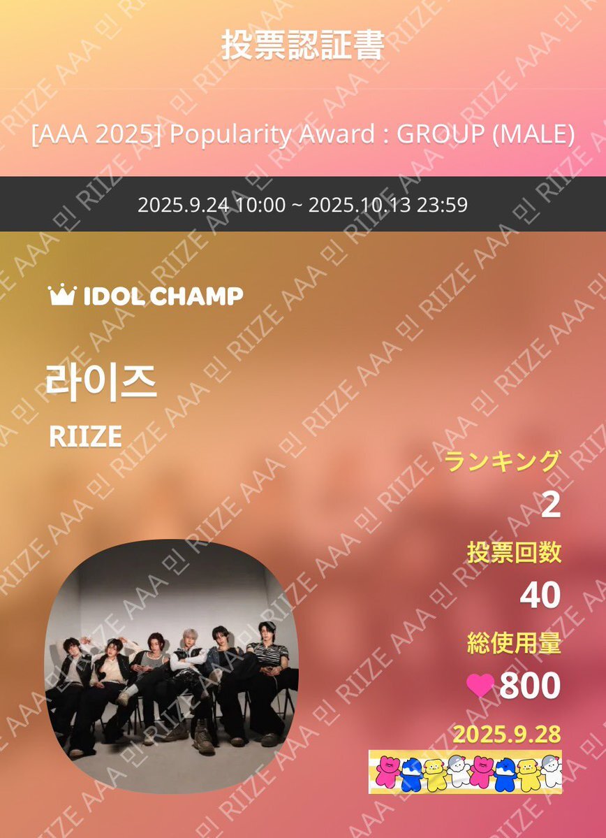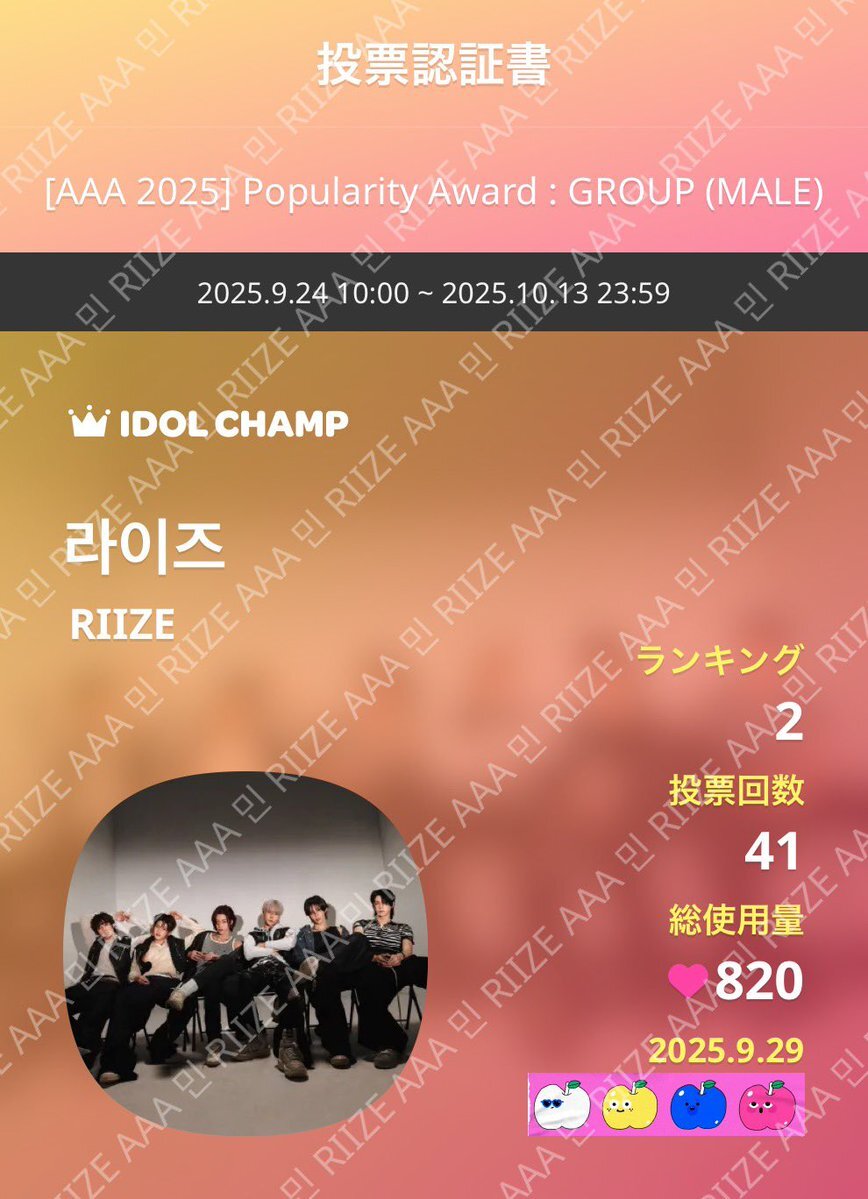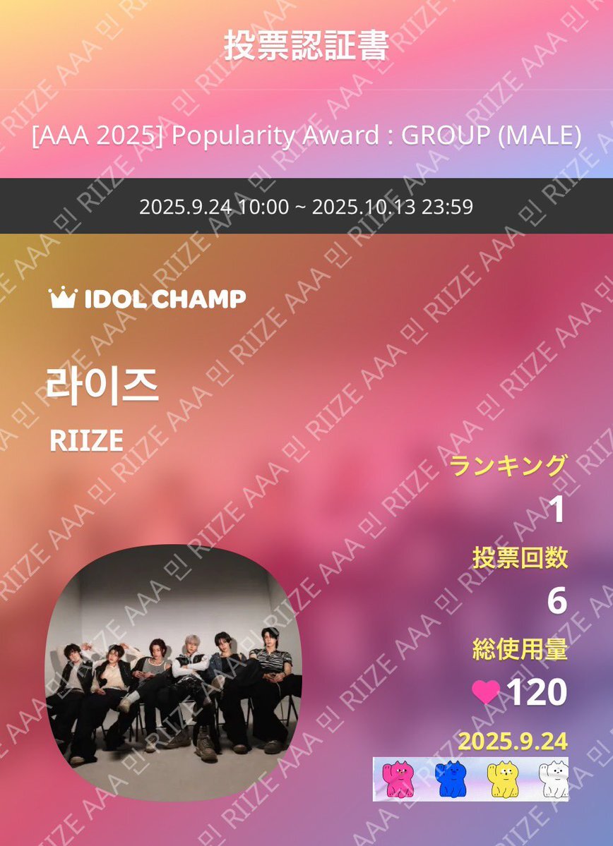 10.12 RIIZE投票分🗳️🧡 AAA投票は ˗ˏˋ 今日まで ˎˊ˗ なのでお忘れなく👊🏻 #BRIIZE_voting #RIIZE投票 #RIIZE_AAA投票 #RIIZE_アユクデ投票 pic.x.com/TvpLYmwXOp