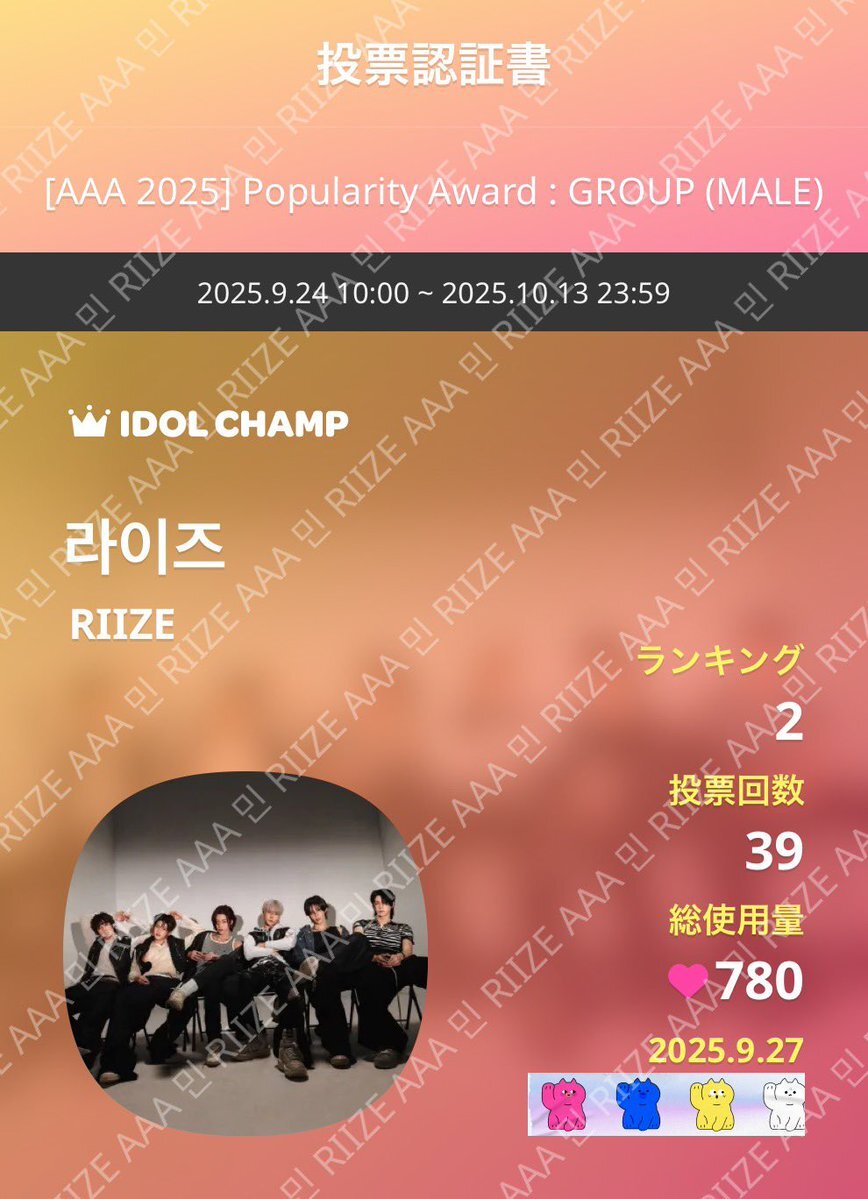 10.11 RIIZE投票分🗳️🧡 アユクデ投票は ˗ˏˋ 今日まで ˎˊ˗ なのでお忘れなく👊🏻 #BRIIZE_voting #RIIZE投票 #RIIZE_AAA投票 #RIIZE_アユクデ投票 pic.x.com/hY0DsWlHJP