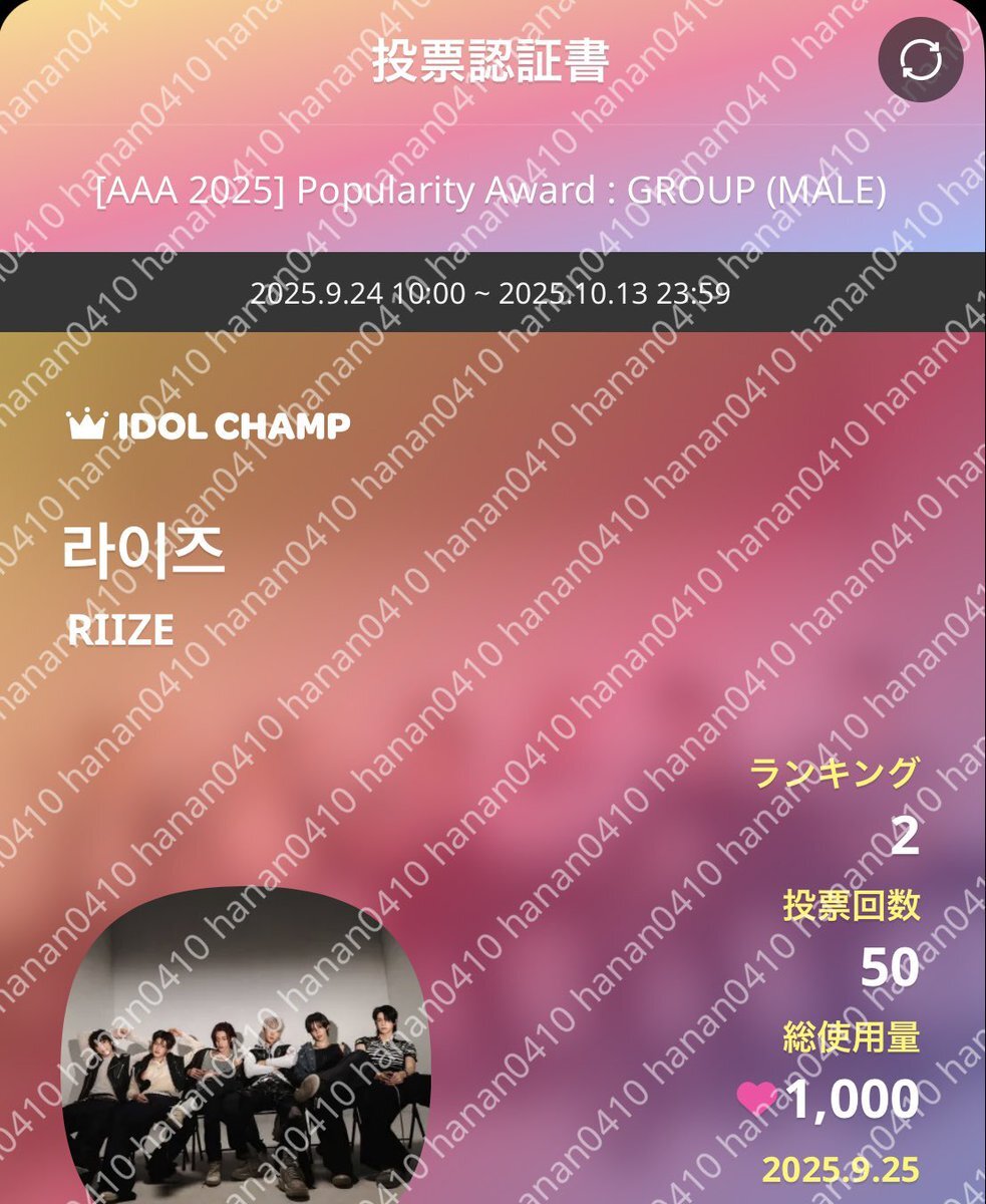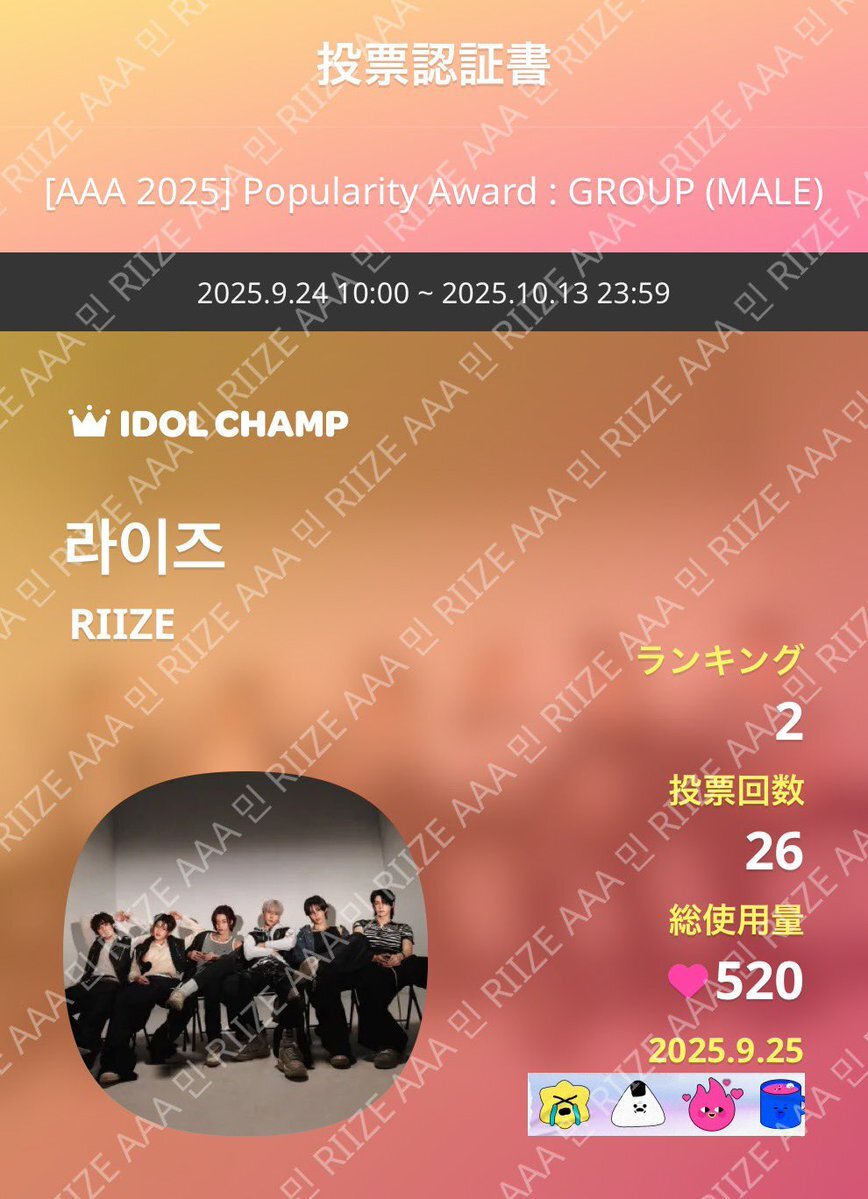 09.25 RIIZE投票分🗳️🧡 #RIIZE_voting #RIIZE投票 #RIIZE_AAA投票 KGMAベストアーティストの方は今日までなのでお忘れなく!◎ pic.x.com/A3soE6LzgG