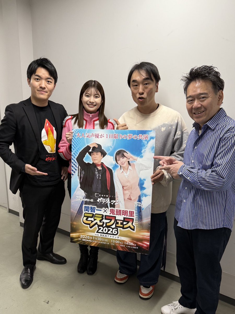 今日はこのメンバーでフライヤーを配っています✨✨ 「こえフェス2026」に出演される #関智一 さんにお会いできました‼️ 本日開催の「KPF2025」14:55〜(いいちこグリーンステージ)に出演されるということです🔥 午後も小倉駅で配ります!! #こえフェス2026 #鬼頭明里 #RKB #アナウンサー pic.x.com/2aL9SeCP2R