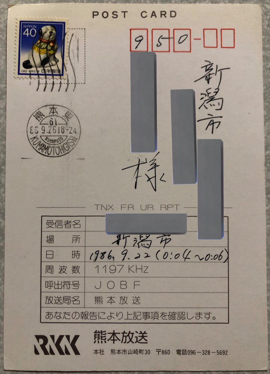 ベリカード51回目は『RKK熊本放送』🧸 熊本1197kHzを受信📻 茨城放送と周波数が被るのですが、日曜深夜の時間帯を狙っての受信でした🗓️ 高校の修学旅行は熊本の阿蘇山にも行きましたが、それ以降行く機会が無いので、いつかまた行きたいですねー😌 #RKK熊本放送 #ベリカード #受信報告書 pic.x.com/MprGsIUq5n