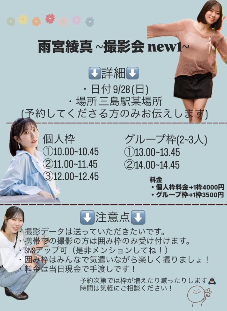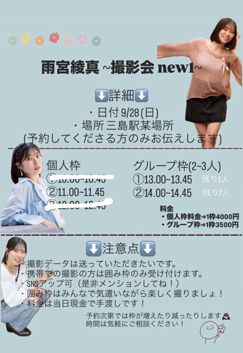【告知です‼️】 『 雨宮綾真 撮影会new1 』 開催決定!!! 9/28(日)に久しぶりの撮影会を行います📸 詳細は画像を見てください👀 質問や時間の相談はDMで受け付けます🙋♀️ ご予約お待ちしております!! #雨宮綾真 #りょまのしずく #撮影会 #撮影会モデル #ポートレート #rt