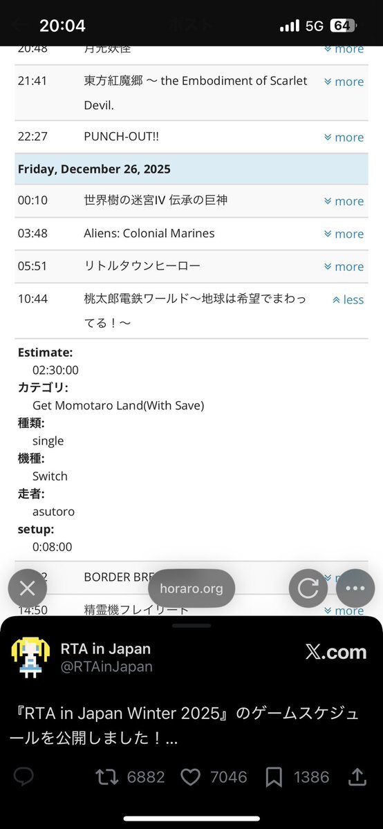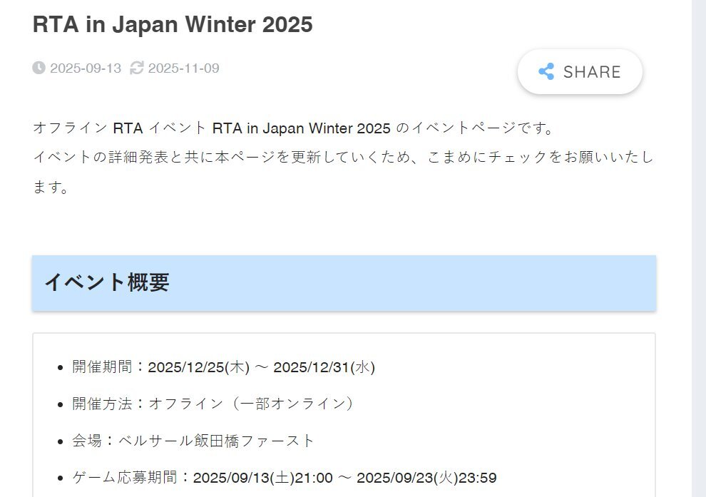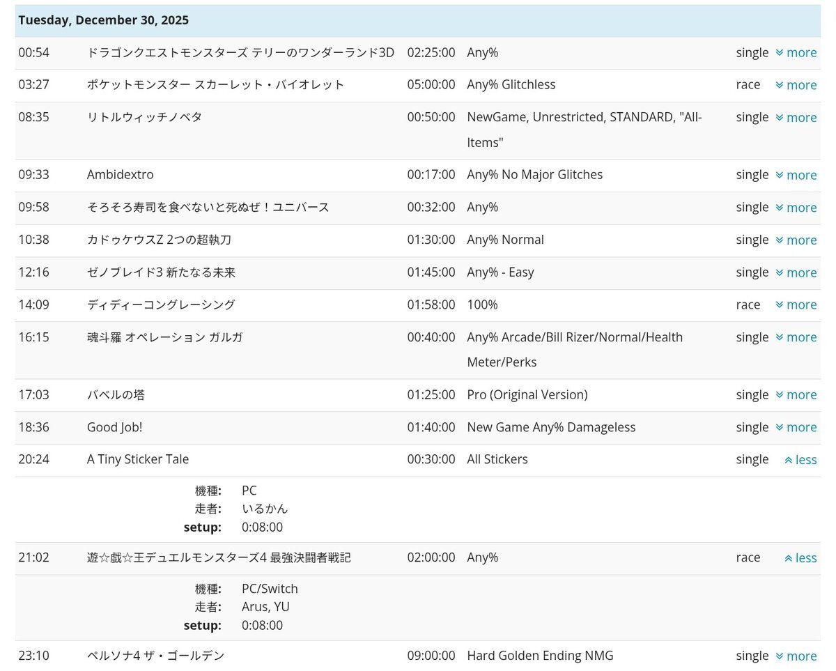 『RTA in Japan Winter 2025』のゲームスケジュールを公開しました! horaro.org/rtaij/rtaijw20… 開始予定は12/25(木)の15時からとなります。 イベントが始まると進行に応じてスケジュールが更新されますので、最新の情報を知りたい場合はページを更新してください。 #RTAinJapan