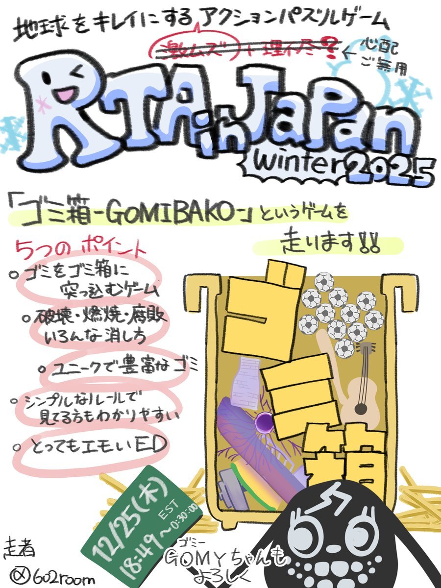 #RTAinJapan スケジュールが確定したため、改めてお知らせします! ゴミ箱-GOMIBAKO-を走るので、お時間のある方は是非30分程お付き合いいただければと思います! 2025/12/25 18:49~ pic.x.com/IRYFd0ikk5 x.com/RTAinJapan/sta…