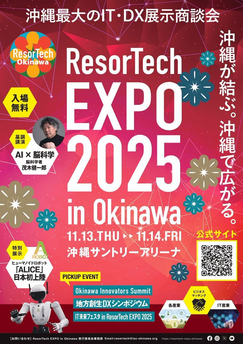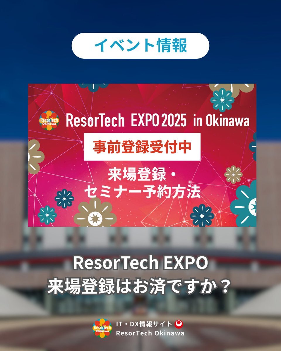 📢【無料!今すぐ登録】 ResorTech EXPO 2025 in Okinawa 今年のテーマは「沖縄が結ぶ。沖縄で広がる。」 IT・DXを活用して沖縄の未来を創造する企業が一堂に会する一大イベントです! 沖縄サントリーアリーナでのリアル展示に加え、 10/1からオンラインで先行配信中のセミナーも見逃せません!