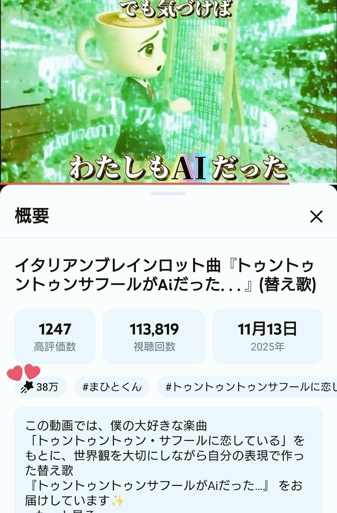 🌱 #まひとくん Youtube 🌱『トゥントゥントゥンサフールがAiだった…』 替え歌 11万回再生突破&ハイプ38万おめでとうございます✨ 高評価&チャンネル登録お願いします️! 🔗youtu.be/oj4fHWjlaK4?si… #ROBLOX #替え歌 #トゥントゥントゥンサフール #ブレインロット pic.x.com/CfOJyuLaie