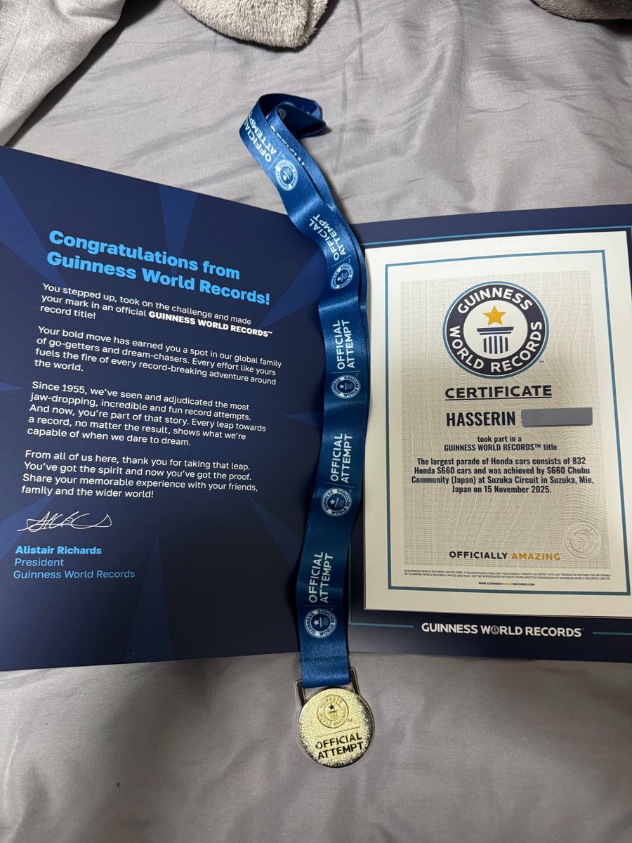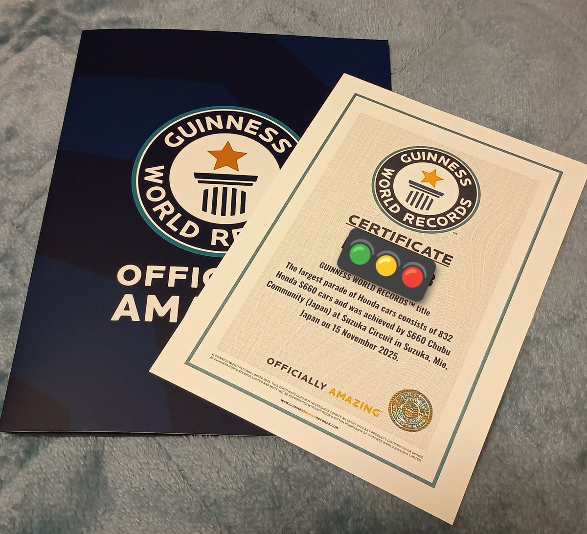 ギネス公式参加認定証が届いた🏅 娘と参加した記念に連名で 娘よ 一緒に挑戦してくれてありがとう😭 #S660 #S660世界一プロジェクト #S660生誕10周年 #ギネス公式参加認定証 pic.x.com/IFJ7rc6aKi