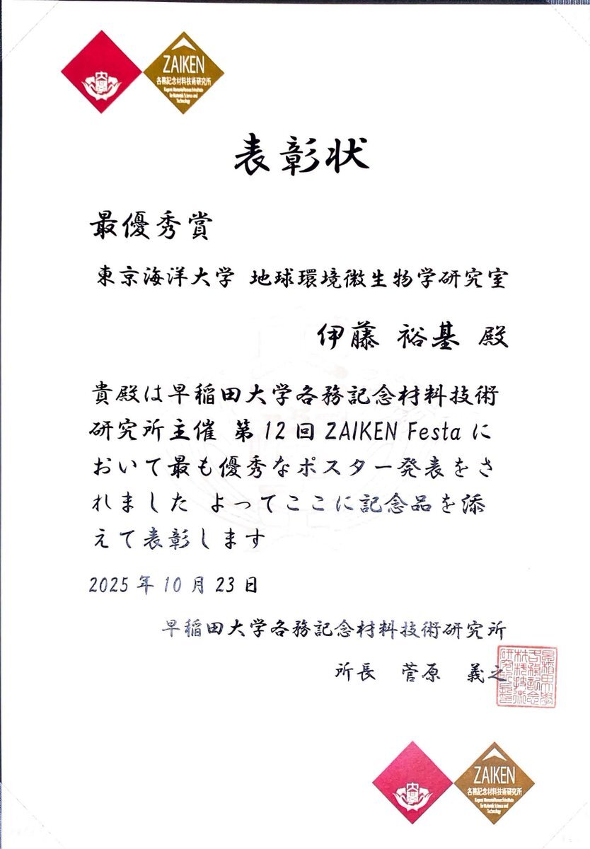 【受賞・表彰🎖】 本学大学院生が第12回 #ZAIKEN Festaにおいて最優秀賞を受賞しました! おめでとうございます🎉 #東京海洋大学 #SDGs6 #SDGs11 #SDGs12 #SDGs15 kaiyodai.ac.jp/faculty/gradua… pic.x.com/zwxXUQyrHI