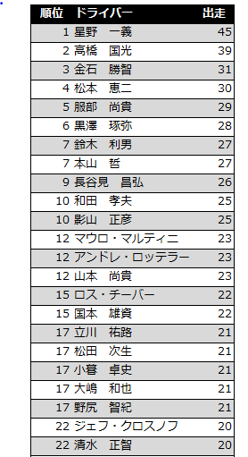 98戦行われた富士スピードウェイでのトップフォーミュラ。出走20戦以上のドライバーがこちらです。 1位はやはり星野一義選手で45戦、2位高橋国光選手39戦、3位金石勝智選手31戦、4位松本恵二選手30戦。この4人が30戦以上の出走です。 全出走ドライバーは276人でした。 #SFormula pic.x.com/TsgU2scRMy