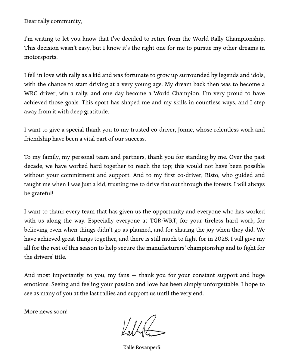 Kalle will take on an exciting new challenge with TGR next year, racing in Super Formula in a transition never seen before in motorsport 🏎️🤩 In the meantime, we’re focused together on closing this chapter as strongly as possible 💪 📝 tgr-wrt.com/kalle-rovanper…