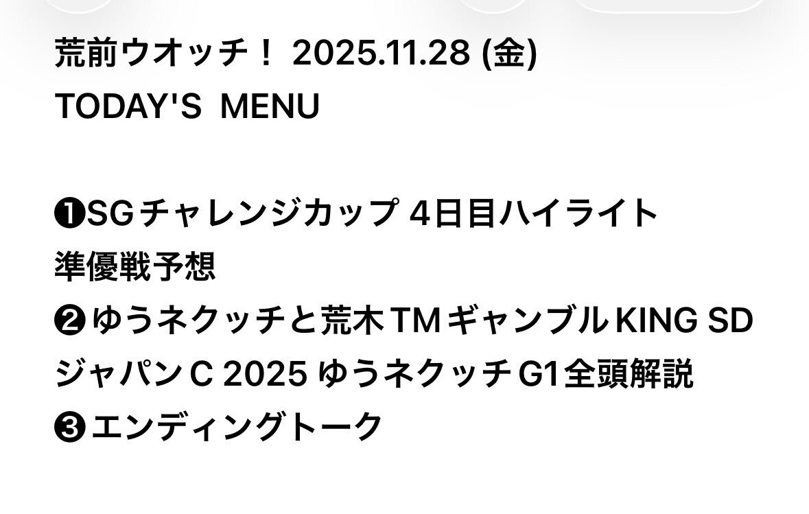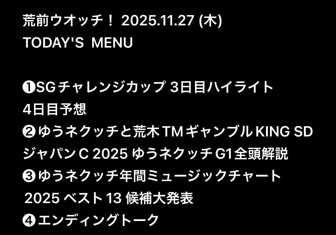 木曜お疲れ様でした。#ジャパンC 枠順出てました(笑)#難解ホークス レースになる予感します。#タスティエーラ 大外枠はガッカリ。そして #SG福岡 3日目 平高さんヤリましたね。素晴らしいまくり刺しでした👏では #荒前ウオッチ 18時30分からスターティン。もちろん #ゆうネクッチG1全頭解説 やります pic.x.com/F6YNUkg7pg
