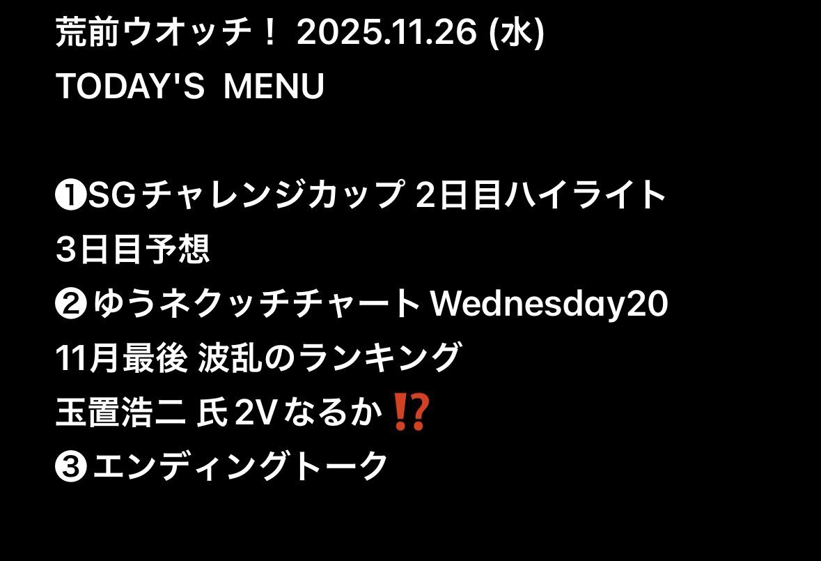水曜お疲れ様でした♪ まぁまた荒れましたね #SG福岡 2日目 しかし昨日の #荒前ウオッチ 通りになったのではないでしょうか⁉️では今夜も18時55分からスターティン。今夜は #ゆうネクッチチャートWednesday20 の発表です 果たしてNo.1は⁉️#チャレンジカップ pic.x.com/klvmkoHZMa