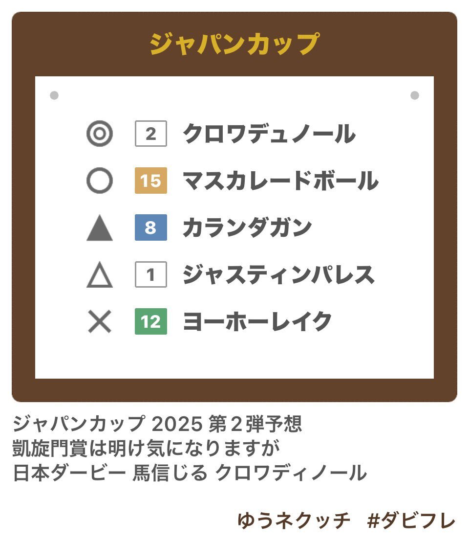 改めておはようございます☀土曜日良い天気ですね。1日よろしくお願いします🙇🏻#SG福岡 は果たして… #京都2歳ステークス はエア。そして現時点での #ジャパンカップ 印はこちら。#ゆうネクッチG1全頭解説 はすでに完成。8時半に #note UP予定してます🗓️#ゆうネクッチサインギャンブル予想 #ダビフレ