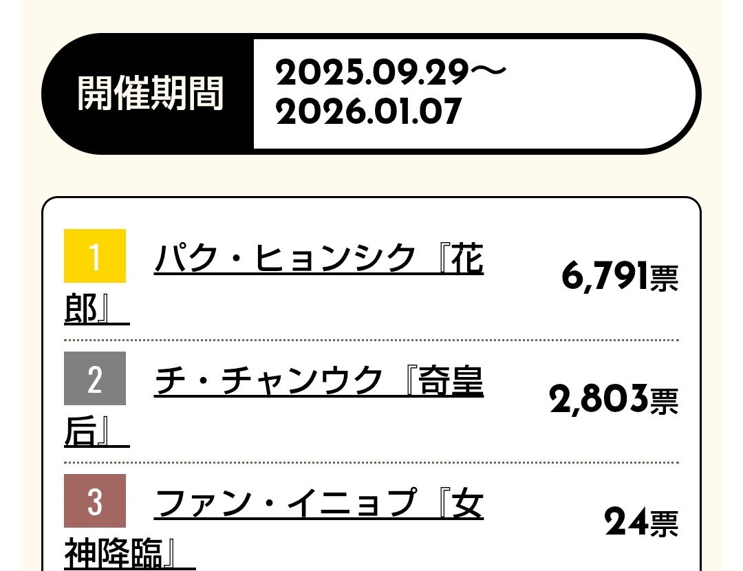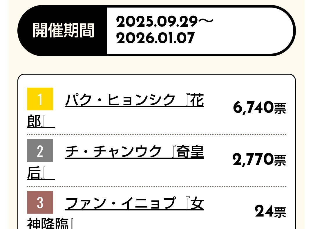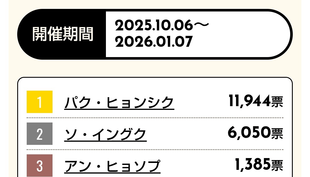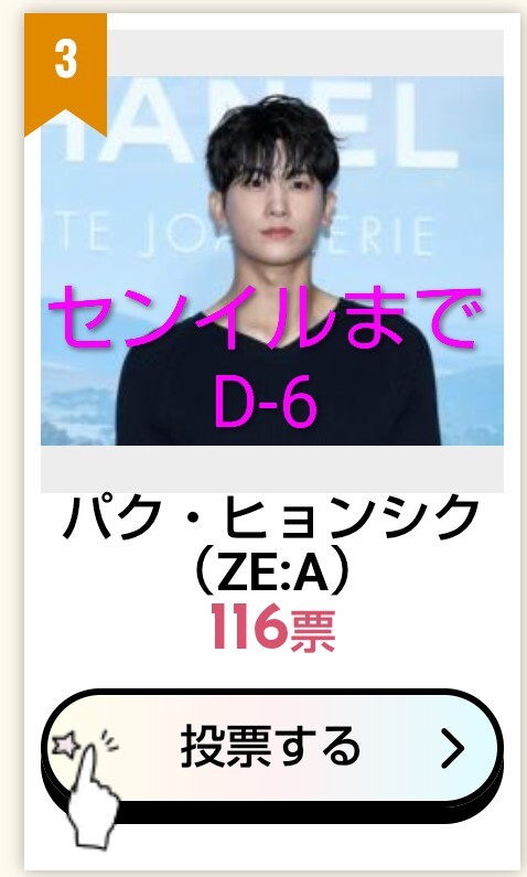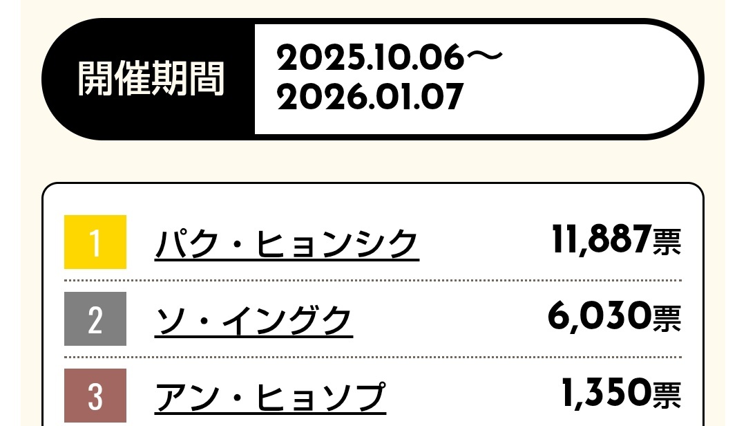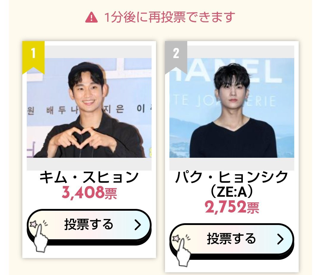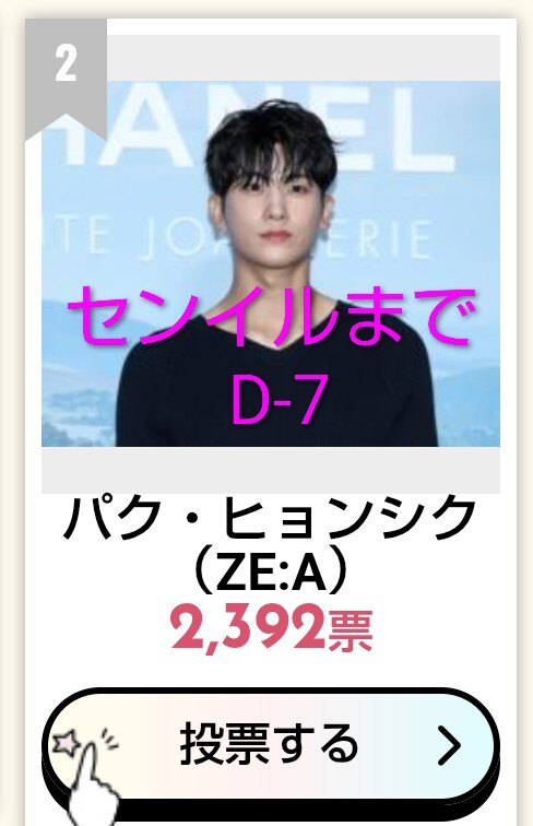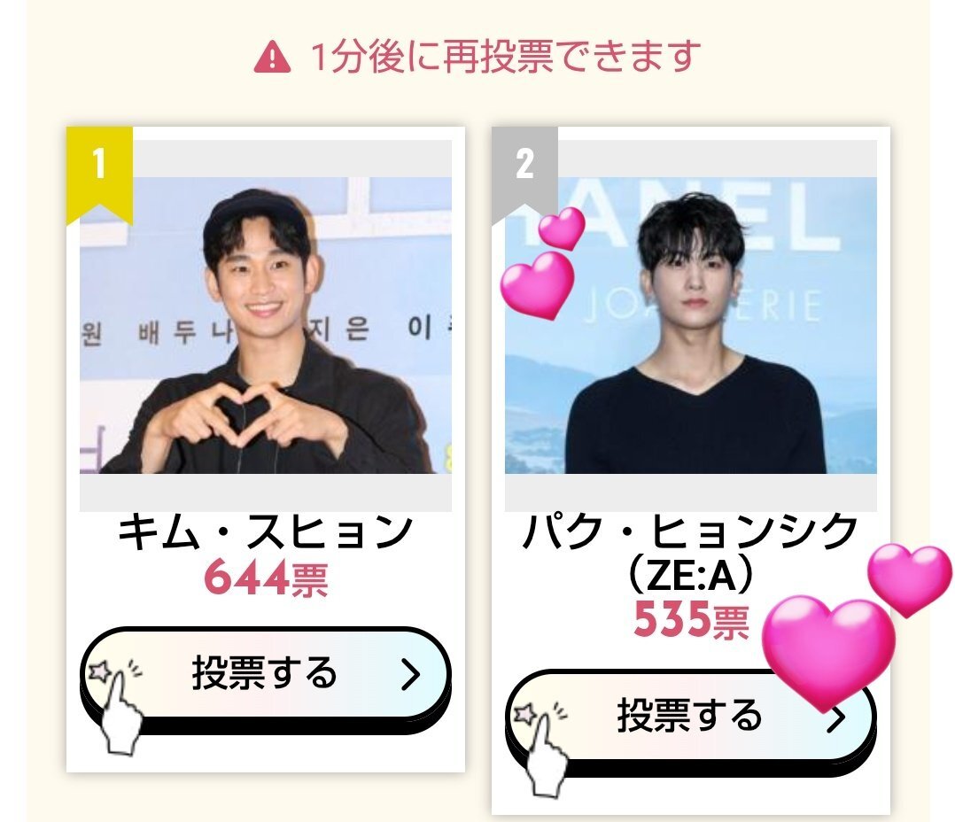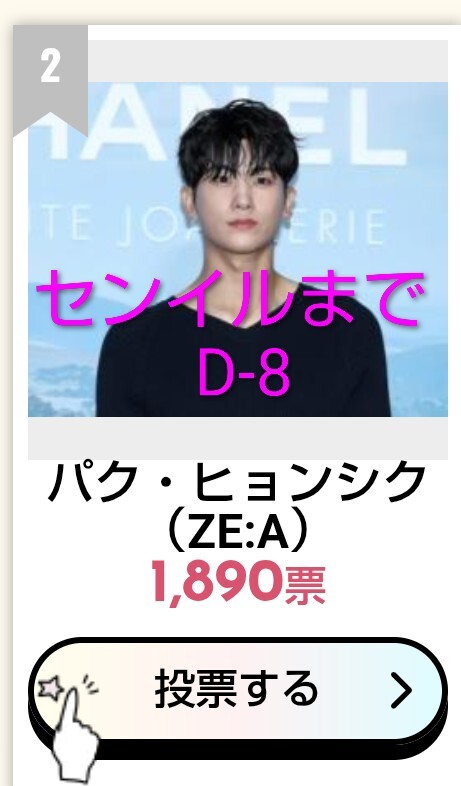 今週もポチッとお付き合いありがとうございました。 小顔は現在2位ですが 先週よりも差が1000票も縮まってます。 1位目指しましょう💕 #SIKcretDay #パクヒョンシク #박형식 小顔 2位 kboard.jp/vote/132/ 最強二番手 1位 kboard.jp/vote_ranking/1… リアル王子様 1位 kboard.jp/vote_ranking/1… pic.x.com/tTJOo3vJeA