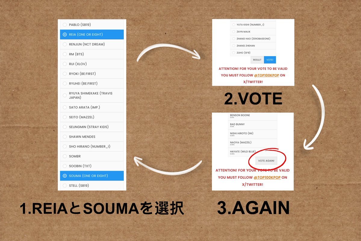 そうそう!とても分かりやすい💕 1回で複数人選択出来るから #SOUMA と #REIA 押してね✨👍 @TOP100KPOPのフォローも忘れないでね😉 #ONEOREIGHT #1DERZ #1OR8 x.com/area_reia/stat…