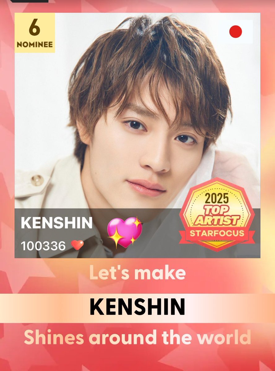現在6位✨️ 連日のアイテム発動ありがとうございます✨️コツコツ愛♥を!! #KENSHIN is participating in - Star Focus Top Artist in Asia Pacific, Please vote to make a difference. 🗓️November 16-30 (BKK) 🔗Voting Link: starfocus.online/main/973?s=W6m… #StarFocus #STARFOCUSTOPARTIST #KENSHIN