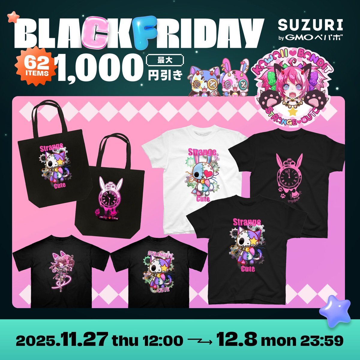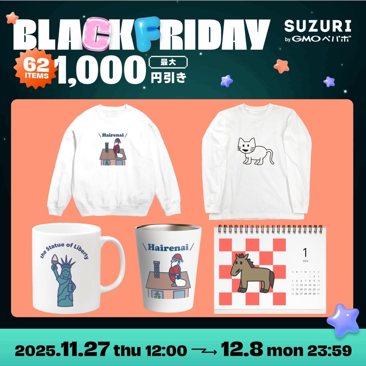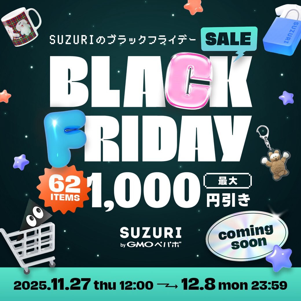 ◤              ◥  #SUZURIのブラックフライデー      ⭐️スタート⭐️ ◣               ◢ ついに始まりマシた!! これまでに発売されているアイテムはもちろん、新作アイテムも含めて62種類が対象デス! ▼期間 2025年11月27日(木)12:00 ~ 12月8日(月) 23:59