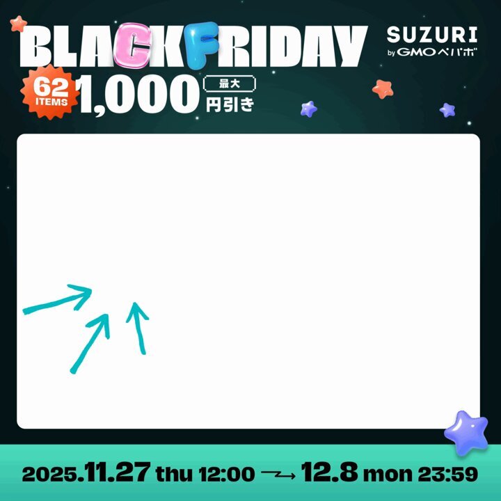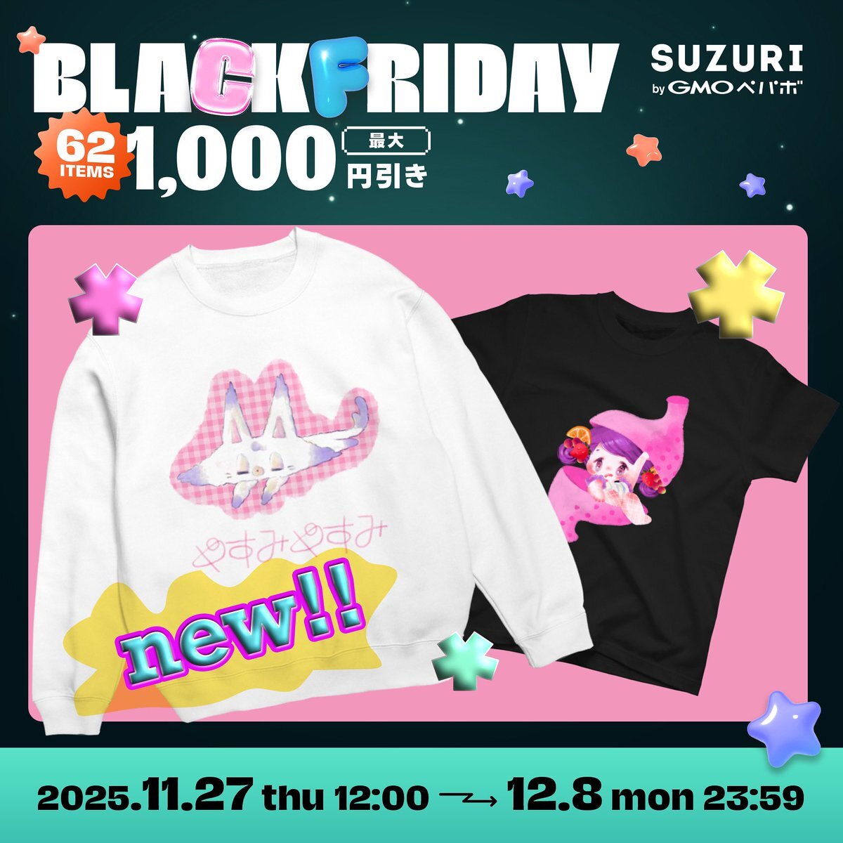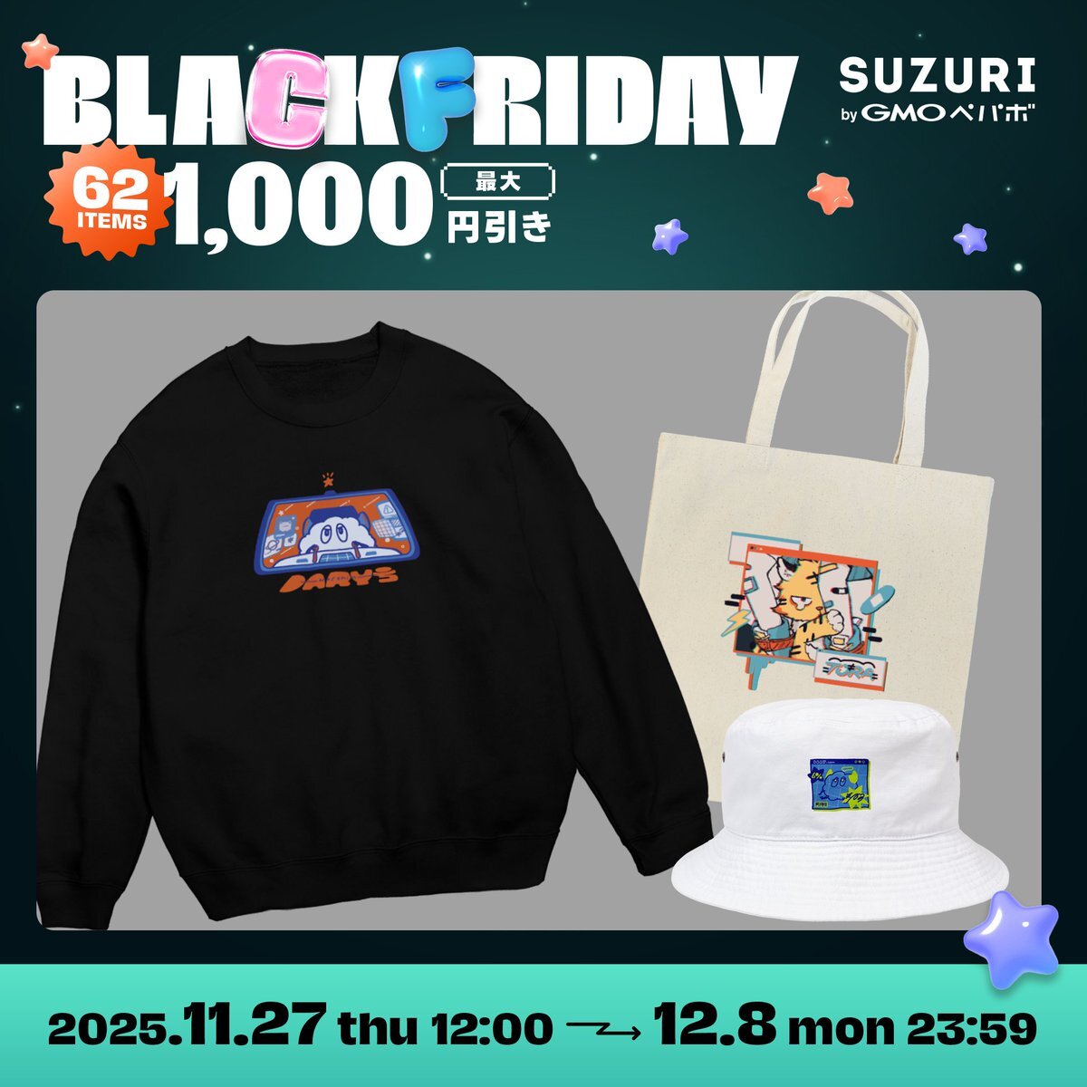 ◤              ◥  #SUZURIのブラックフライデー      ⭐️スタート⭐️ ◣               ◢ ついに始まりマシた!! これまでに発売されているアイテムはもちろん、新作アイテムも含めて62種類が対象デス! ▼期間 2025年11月27日(木)12:00 ~ 12月8日(月) 23:59