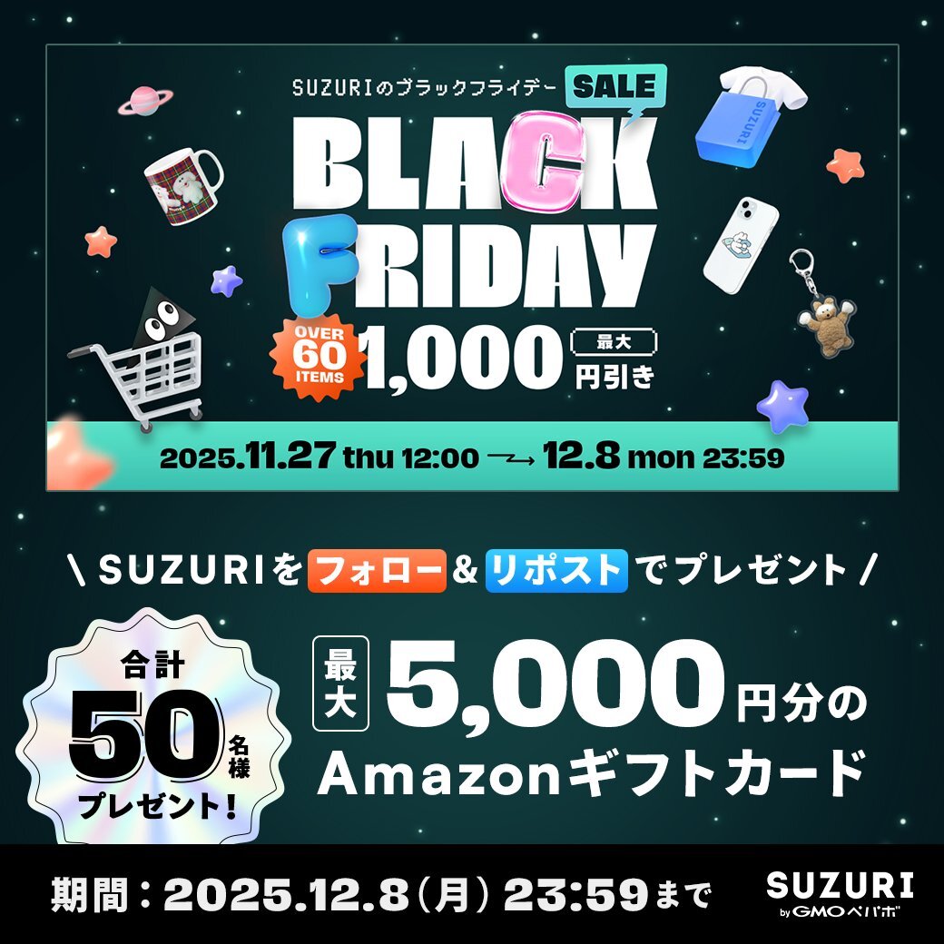 \  #SUZURIのブラックフライデー 開催中/ 50名様に最大5,000円分のAmazonギフトカードをプレゼント🎁✨ 1️⃣ @suzurijpをフォロー! 2️⃣この投稿をリポスト 応募は12月8日(月)23:59まで!⭐️ 👇詳しくはこちら👀 suzuri.jp/media/journal_…