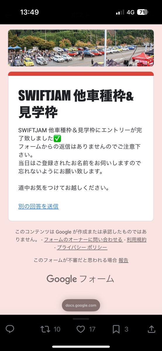 #SWIFTJAM2025で会いましょう #SWIFTJAM 自走で行くことになりました。 ドノーマルの車ですが、OB枠として参加させて頂きます! 皆さんよろしくお願いします🙇 pic.x.com/zluNb0sAis