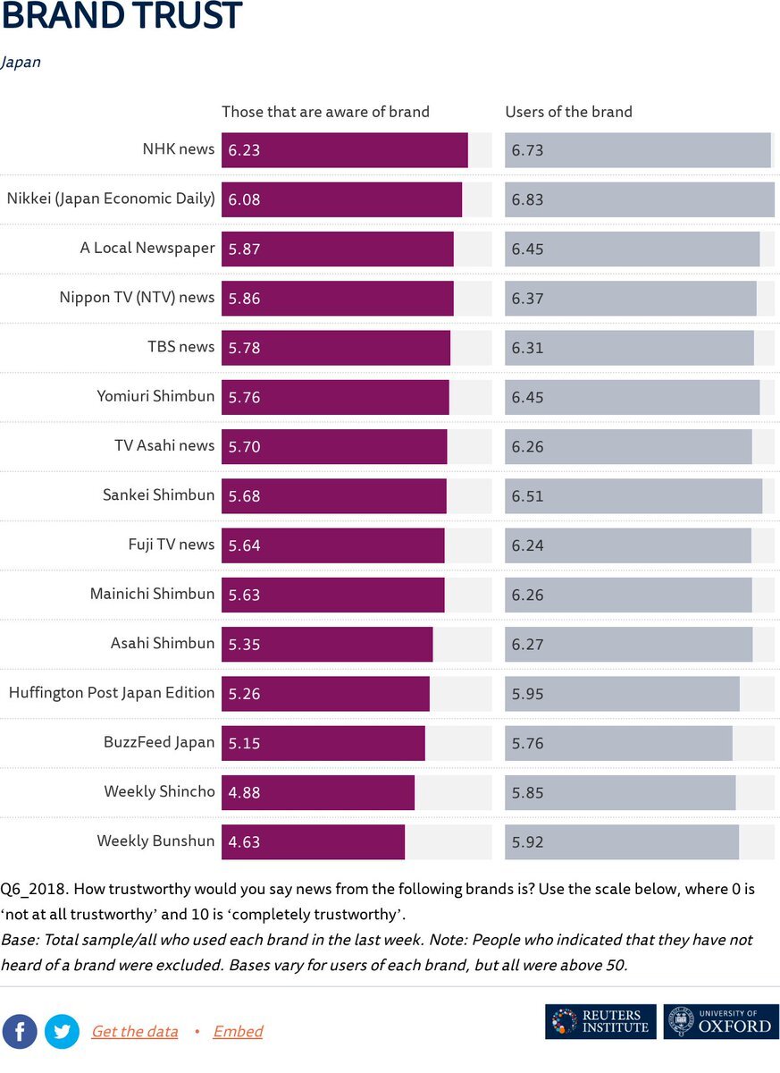 オックスフォード大学ロイター・ジャーナリズム研究所 Digital NEWS REPORT 2018 digitalnewsreport.org/survey/2018/ja… 日本の新聞信頼度は日経>地方紙>読売>産経>毎日>朝日