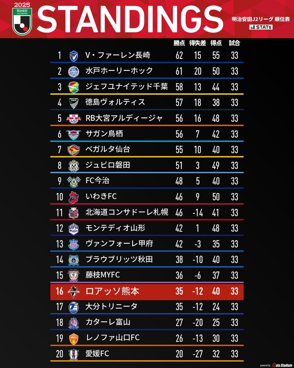 本日の全試合を終えての最新順位表 🏆明治安田J2リーグ #ロアッソ熊本 #SPARK pic.x.com/dN3gFTIJpn