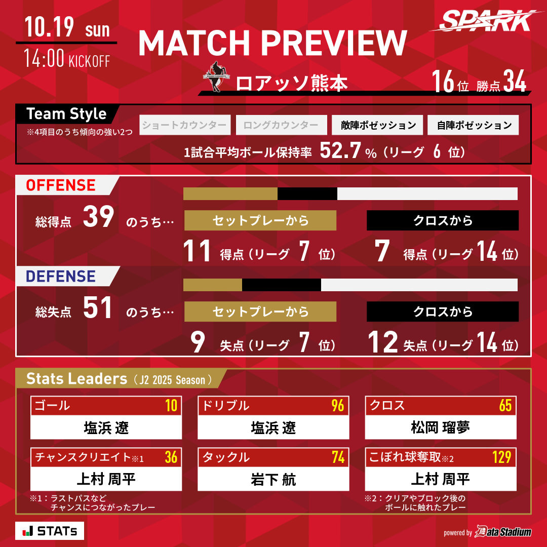 📊詳細データ 🏆明治安田J2リーグ 第33節 🆚#モンテディオ山形 🗓 10/19 14:00キックオフ 🏟#NDソフトスタジアム山形 応援よろしくお願いします! #ロアッソ熊本 #SPARK #DAZN 加入&視聴はこちら 👉prf.hn/click/camref:1… pic.x.com/Vskm7ZEPDt