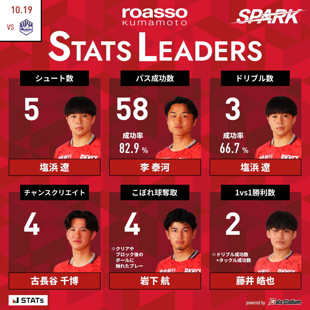 👑本日のスタッツリーダー🐴 シュート数: #塩浜遼 パス成功数: #李泰河 ドリブル数: #塩浜遼 チャンスクリエイト: #古長谷千博 こぼれ球奪取: #岩下航 1vs1勝利数: #藤井皓也 #ロアッソ熊本 #SPARK pic.x.com/MaiXNtQ5Zx