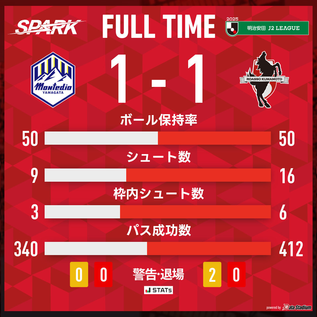 試合終了 🏆明治安田J2リーグ 第33節 #モンテディオ山形 1-1 #ロアッソ熊本 ご声援ありがとうございました。 #SPARK pic.x.com/7M05WSOfX3