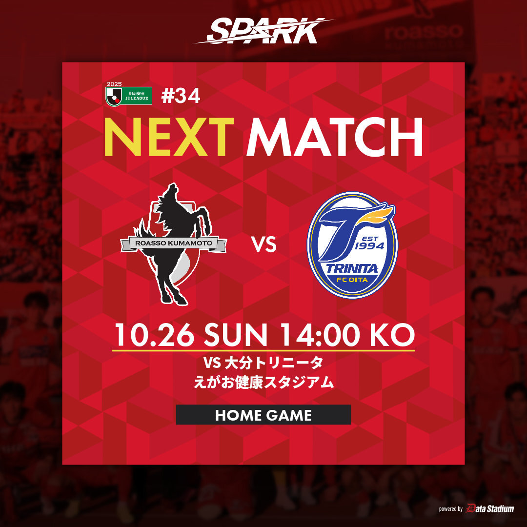 次の対戦カードは 🏆明治安田J2リーグ 第34節 🆚#大分トリニータ 🗓 10/26 14:00キックオフ 🏟#えがお健康スタジアム 次節も応援よろしくお願いします⚽ #ロアッソ熊本 #SPARK pic.x.com/0FIlcneOAH