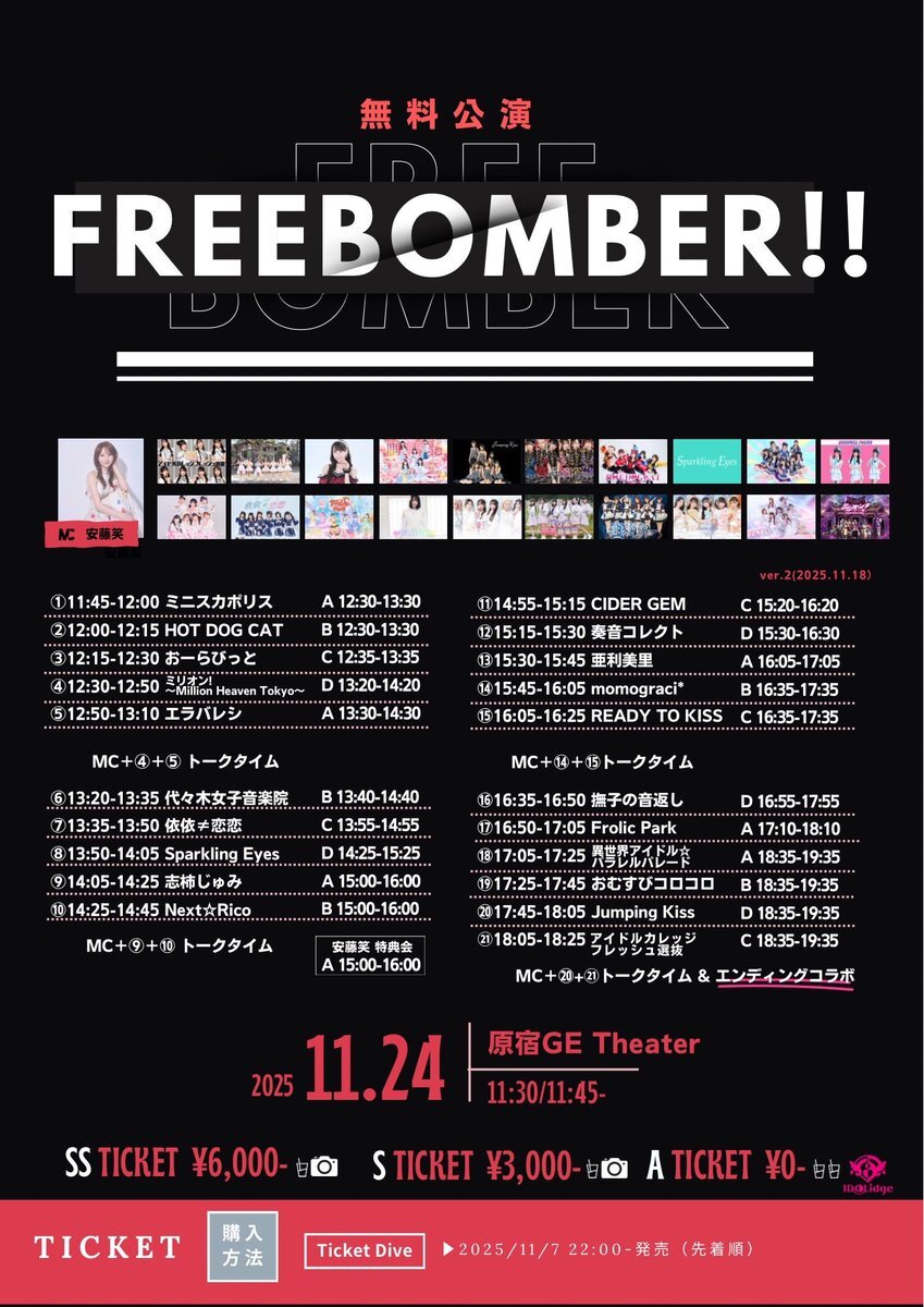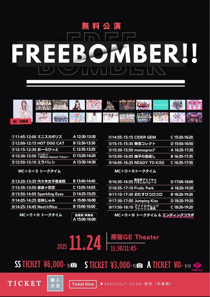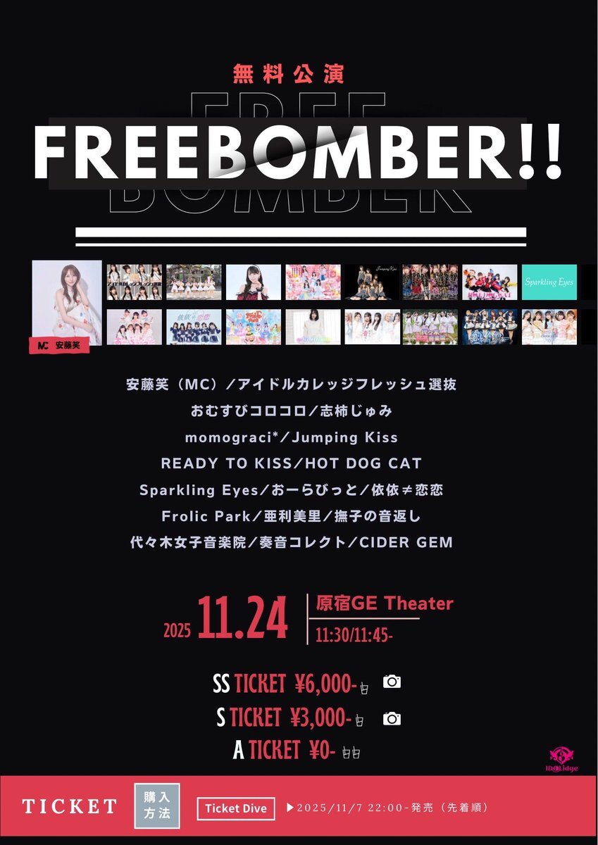 ☆…出演情報…☆ ◤FREEBOMBER!!◢ 2025年11月24日(月) 📍原宿GE Theater OPEN 11:30 / START 11:45 ①SSチケット6,000円 ※一部撮影可 ※再入場可 ②Sチケット3,000円 ※一部撮影可 ③Aチケット 0円 ※ 2Drink別途 ①②1Drink別途 🎫 t-dv.com/251124ge  #SparklingEyes #スパアイ