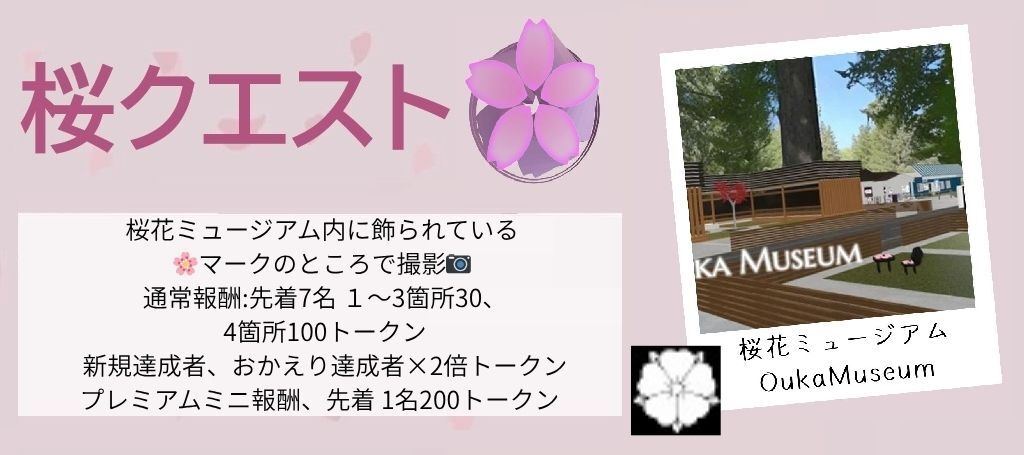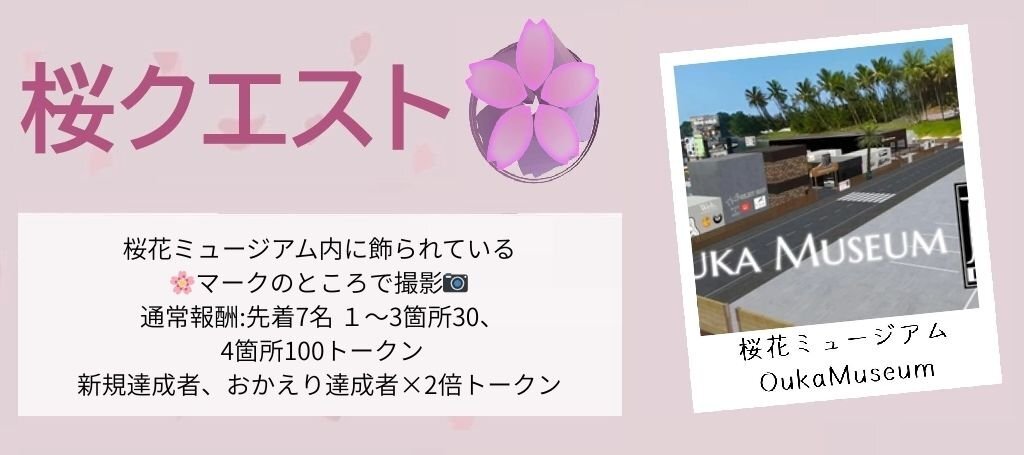 桜クエスト🌸12月2回目 12/5~12/9版 🌈参加方法 桜花ミュージアムに4つ飾られている🌸マークのところで写真を撮影📸 写真と #桜クエスト と @toshinobu_nft をつけてポスト下さい🙏 (私が気付く方法であれば別の方法でも可) 🌈報酬(画像を確認下さい) ※おかえり達成者(先月参加無) #spatial