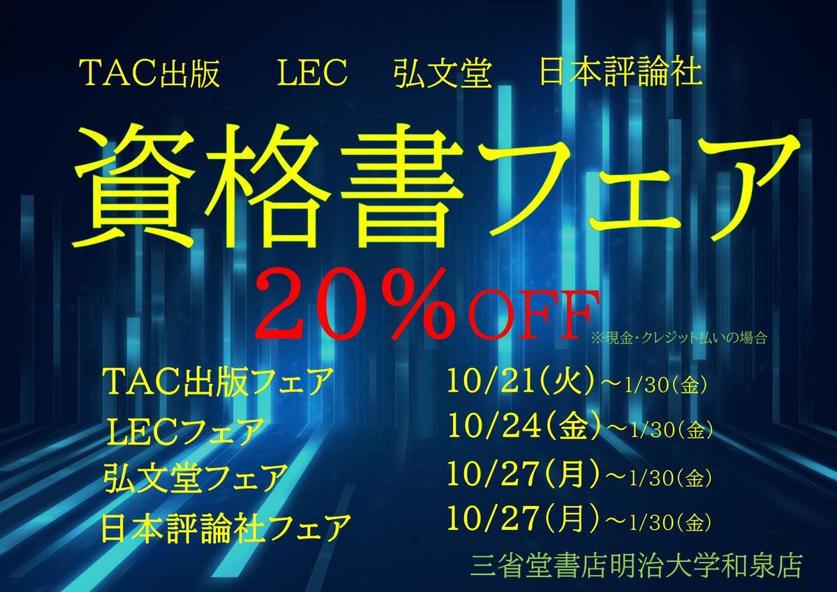 #資格書 フェア開催中!!】 ただいま当店では資格書フェアを順次開催中!! #TAC出版(10/21~1/30),#LEC(10/24~1/30),#弘文堂  #日本評論社(10/27~1/30)の書籍が20%OFF!! (現金・クレジット払いに限ります) 当店は挑戦する学生を、全力で応援します! この機会にぜひご来店ください!!! pic.x.com/EjfNWQoMml