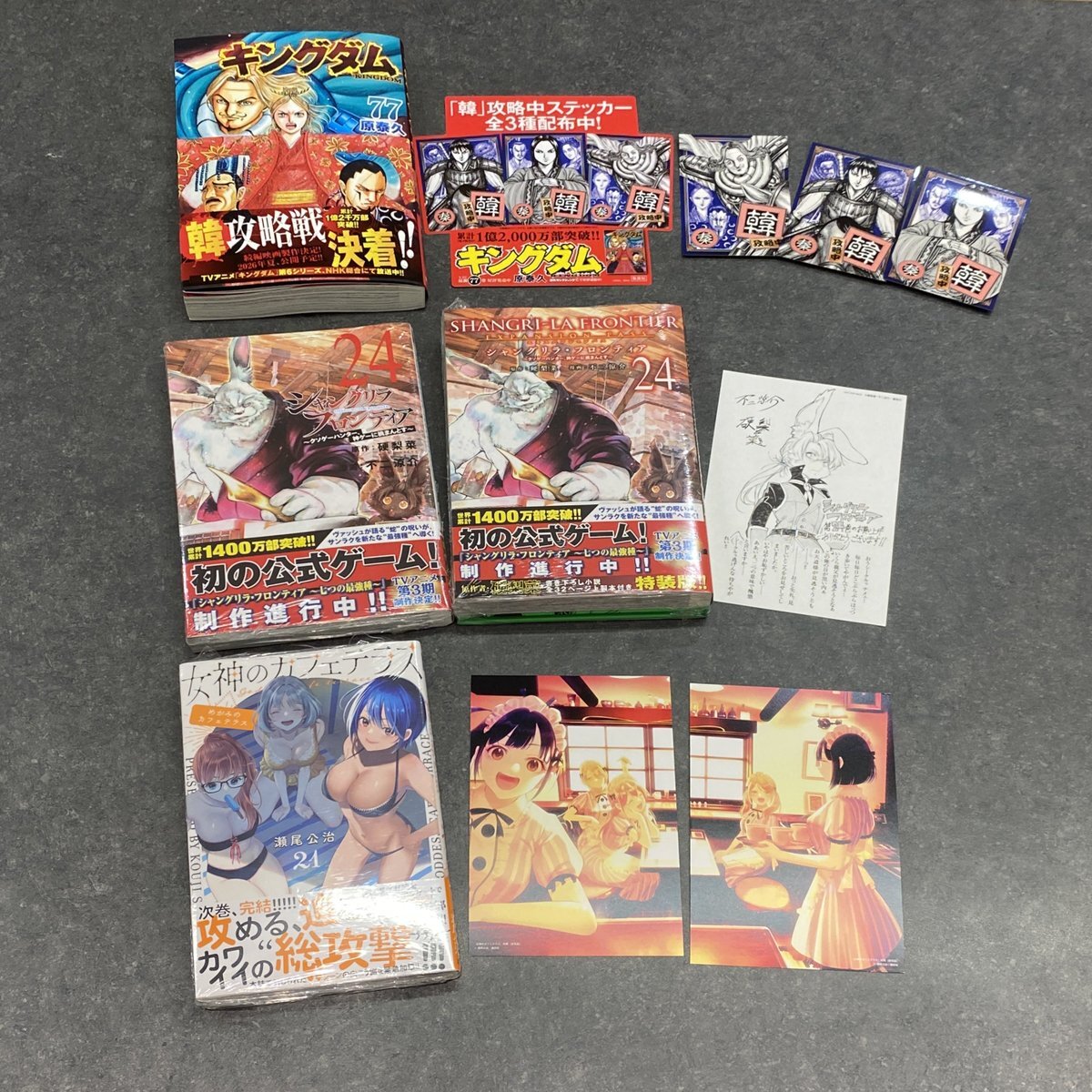 ●集英社特典 ✽「韓」攻略中ステッカー(ランダム配布) 『#キングダム』77巻 ●講談社特典 ✽ペーパー 『#シャングリラ・フロンティア』24巻 ✽イラストカード(ランダム配布) 『#女神のカフェテラス』24巻 おひとり様各巻2冊まで なくなり次第配布終了 #TSUTAYA #カメイドクロック #TBS亀戸 pic.x.com/9RC2AOgdHI