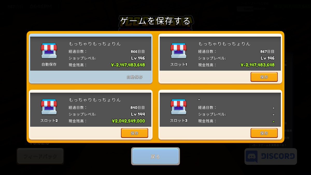 JPYだと21億~ってのがダメで(オーバーフロー?)他の単位にするとマイナスはつかないんだよな。USDあたりで試してみて売上が加算されるかなんだけど試す価値ありなのかどうなのか。とはいえ円じゃないとちょっとわかりにくいのでできれば対処してほしい。 #TCGCardShopSimulator